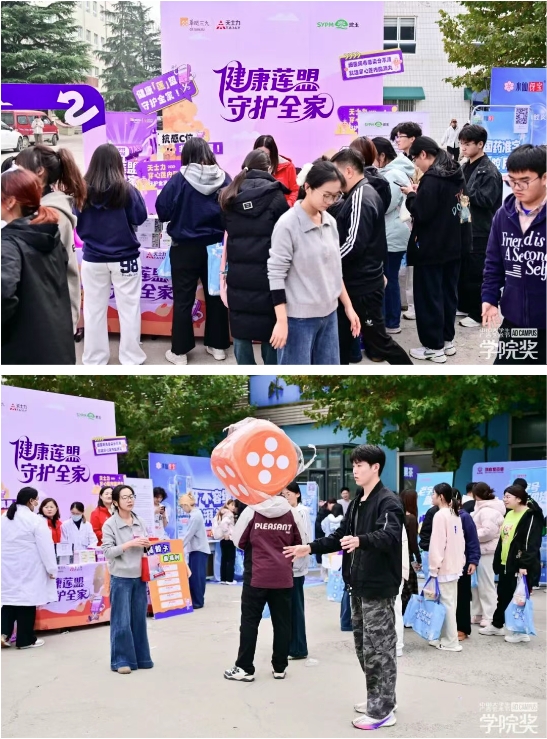 活动伊始,天士力与山东漱玉平民大药房共同精心打造的“健康莲盟补给站”便成为校园里的人气焦点。融合现代设计语言与中医药文化元素的互动展区,吸引同学们纷纷驻足。创意手举牌、幸运骰子、趣味打卡等环节,让健康守护变得可视、可感、可参与。同学们在欢笑中学习防护知识,在互动中深化品牌认知,现场洋溢的青春热情,成为秋日校园最动人的风景。