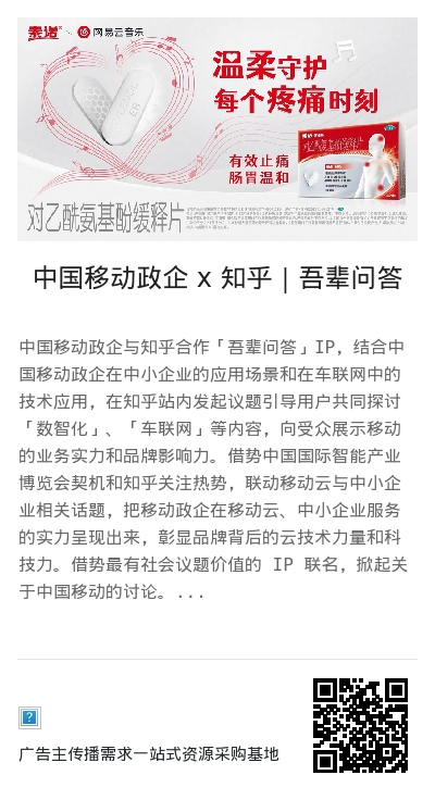 中国移动政企与知乎合作「吾辈问答」IP,结合中国移动政企在中小企业的应用场景和在车联网中的技术应用,在知乎站内发起议题引导用户共同探讨「数智化」、「车联网」等内容,向受众展示移动的业务实力和品牌影响力。
