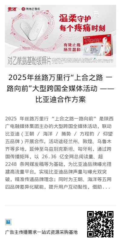2025 年丝路万里行 “上合之路一路向前” 是陕西广电融媒体集团主办的大型跨国全媒体活动,联动比亚迪(王朝 / 海洋 / 腾势 / 方程豹 / 仰望五品牌)开展合作。活动途经兰州、敦煌、乌鲁木齐等多地,延伸至乌兹别克斯坦、匈牙利,通过跨国传播矩阵,以 26.36 亿全网总阅读量、超 2248 条网媒发稿等为基础,为比亚迪品牌曝光搭建高流量平台。