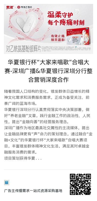 随着我国人口结构的变化,银发群体日益增长的精神文化需求和消费服务需求,正成为备受关注、前景广阔的蓝海市场。 华夏银行深圳分行认真贯彻落实中央决策部署,做好“养老金融”文章,践行金融工作的政治性、人民性,提出“金融向善”的经营服务理念。 深圳广播作为地区最具社交属性的主流媒体,提出让金融品牌更有“声”命力的策划理念,通过融合“金融+文化”的华夏银行杯“大家来唱歌”合唱大赛项目,丰富银发群体精神文化生活,满足其对卓越金融服务消费的需求。 项目策划获得华夏银行深圳分行的高度认可,线上线下和全媒覆盖的推进执行,也让该百万级创收的整合营销项目成为全城关注的文化盛事,成为收获社会效益和经济效益的成功案例。