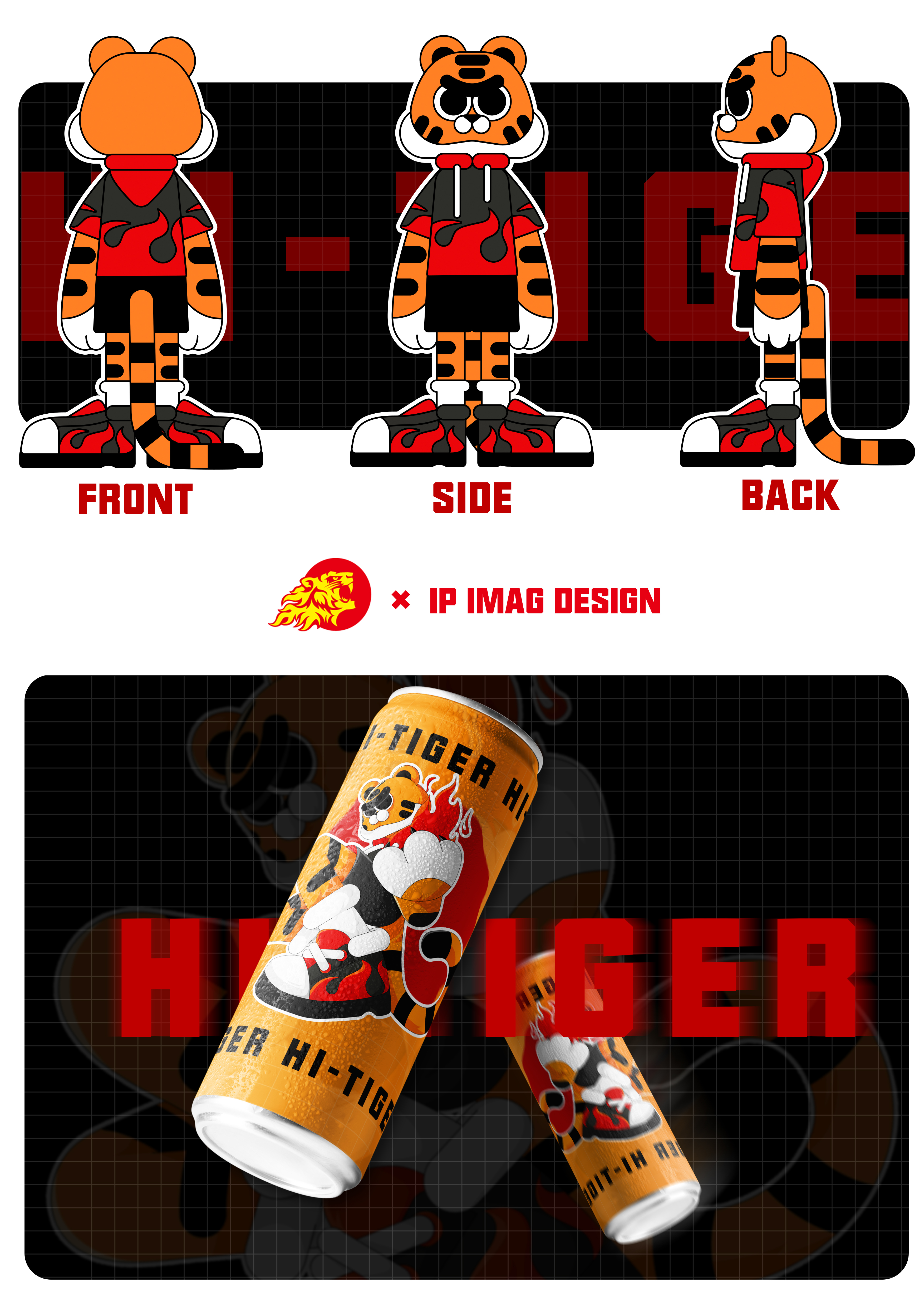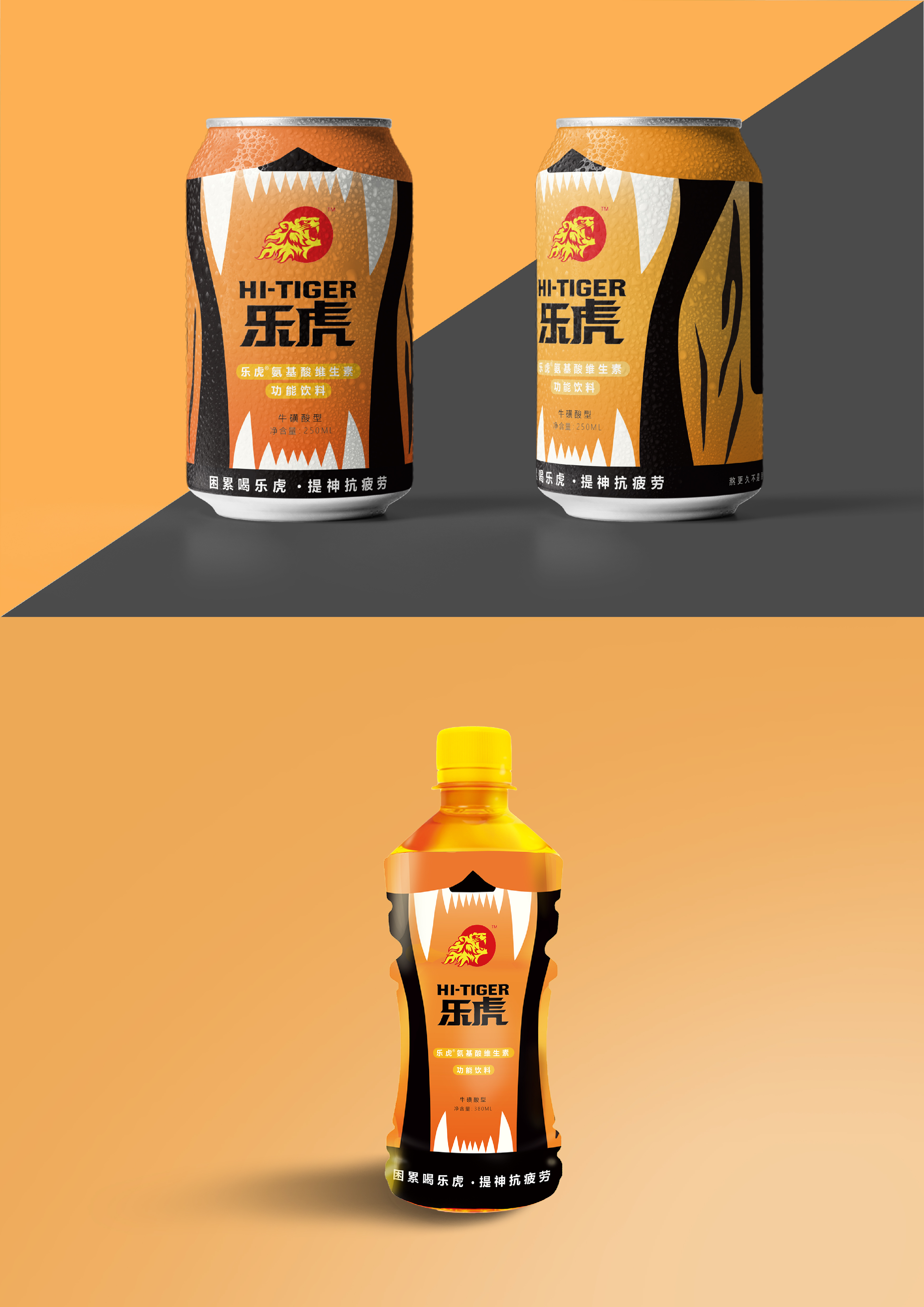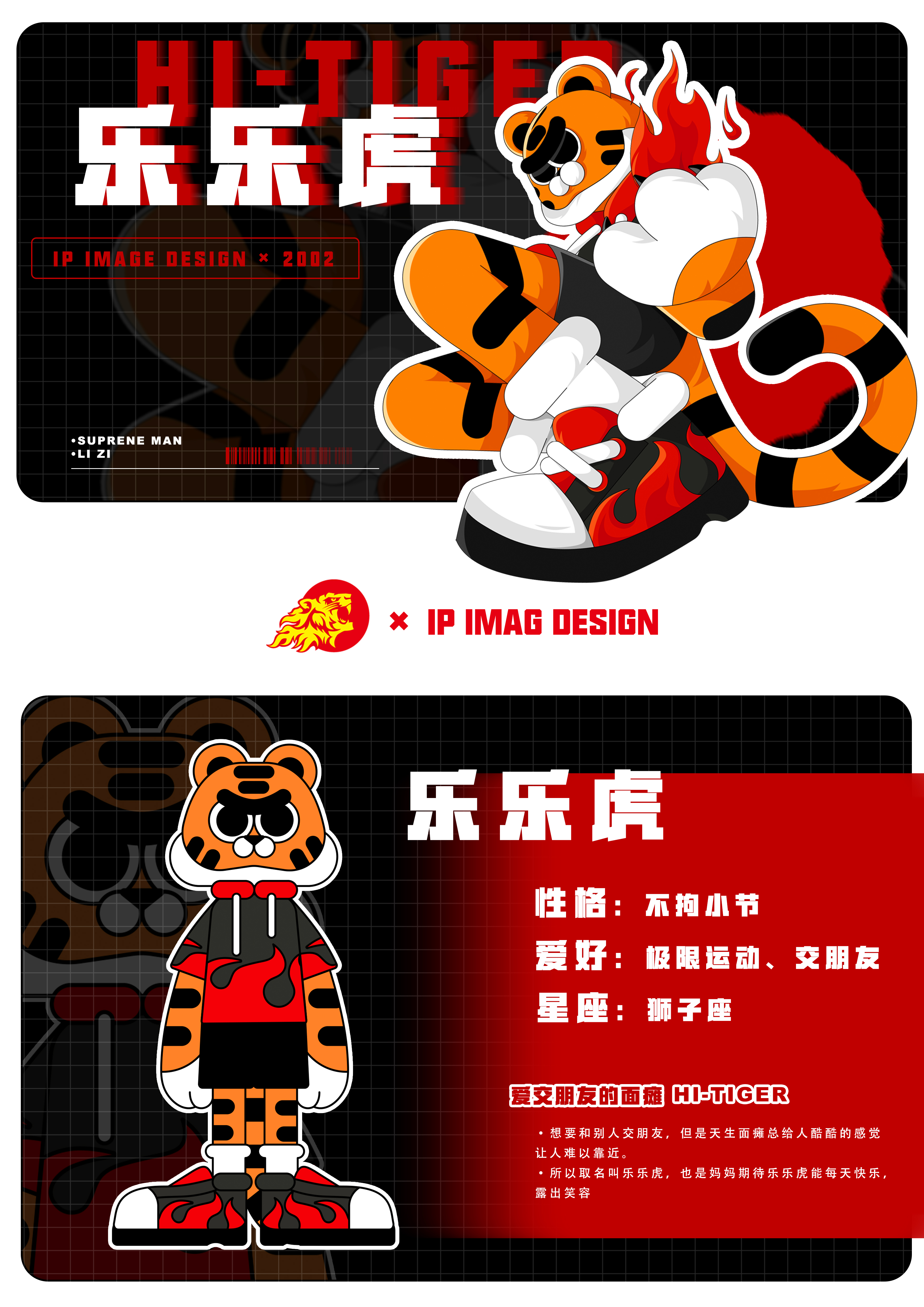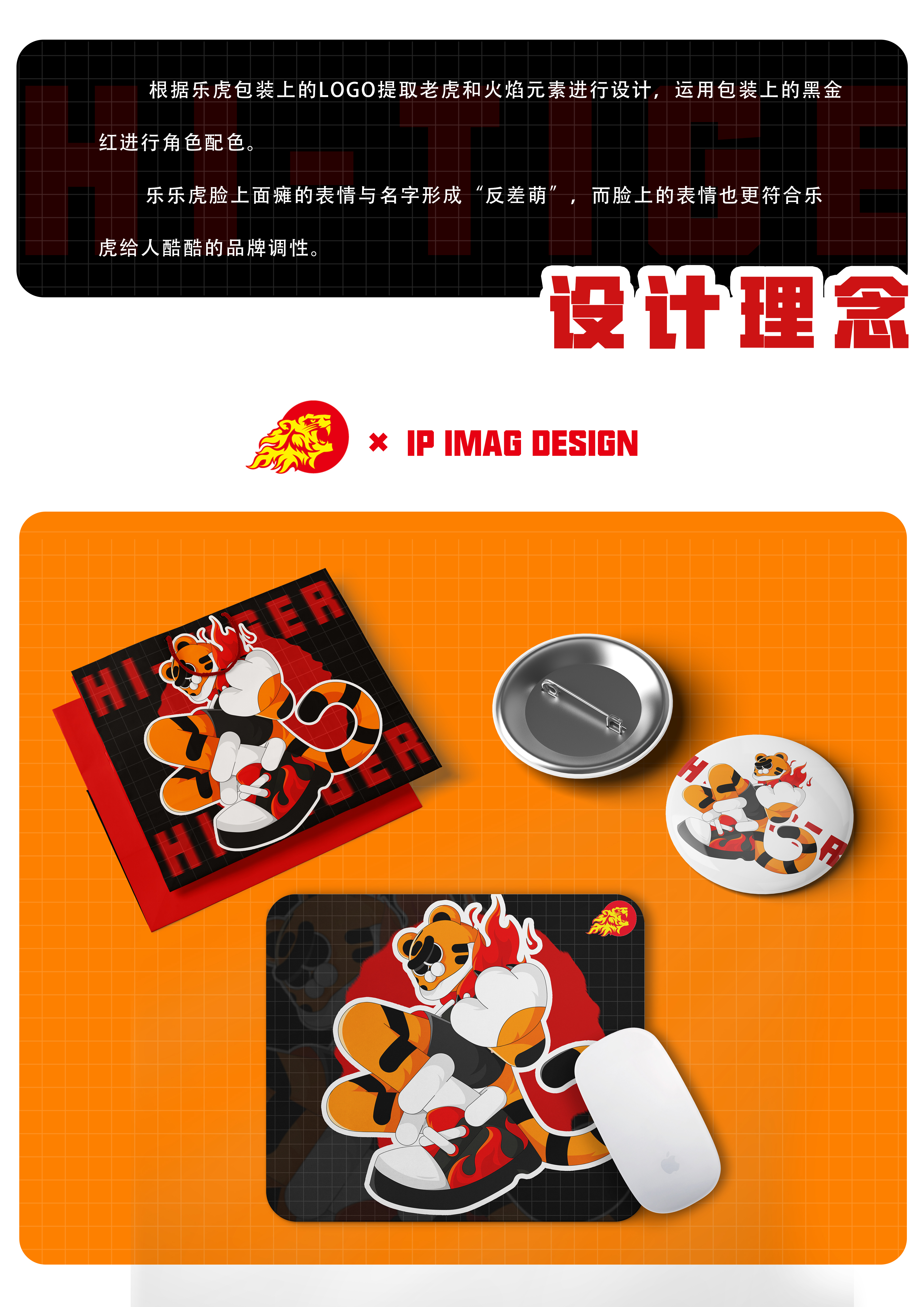 根据乐虎包装上的LOGO提取老虎和火焰元素进行设计,运用包装上的黑金红进行角色配色,乐乐虎脸上面瘫的表情与名字形成“反差萌”,而脸上的表情也更符合乐虎给人酷酷的品牌调性。