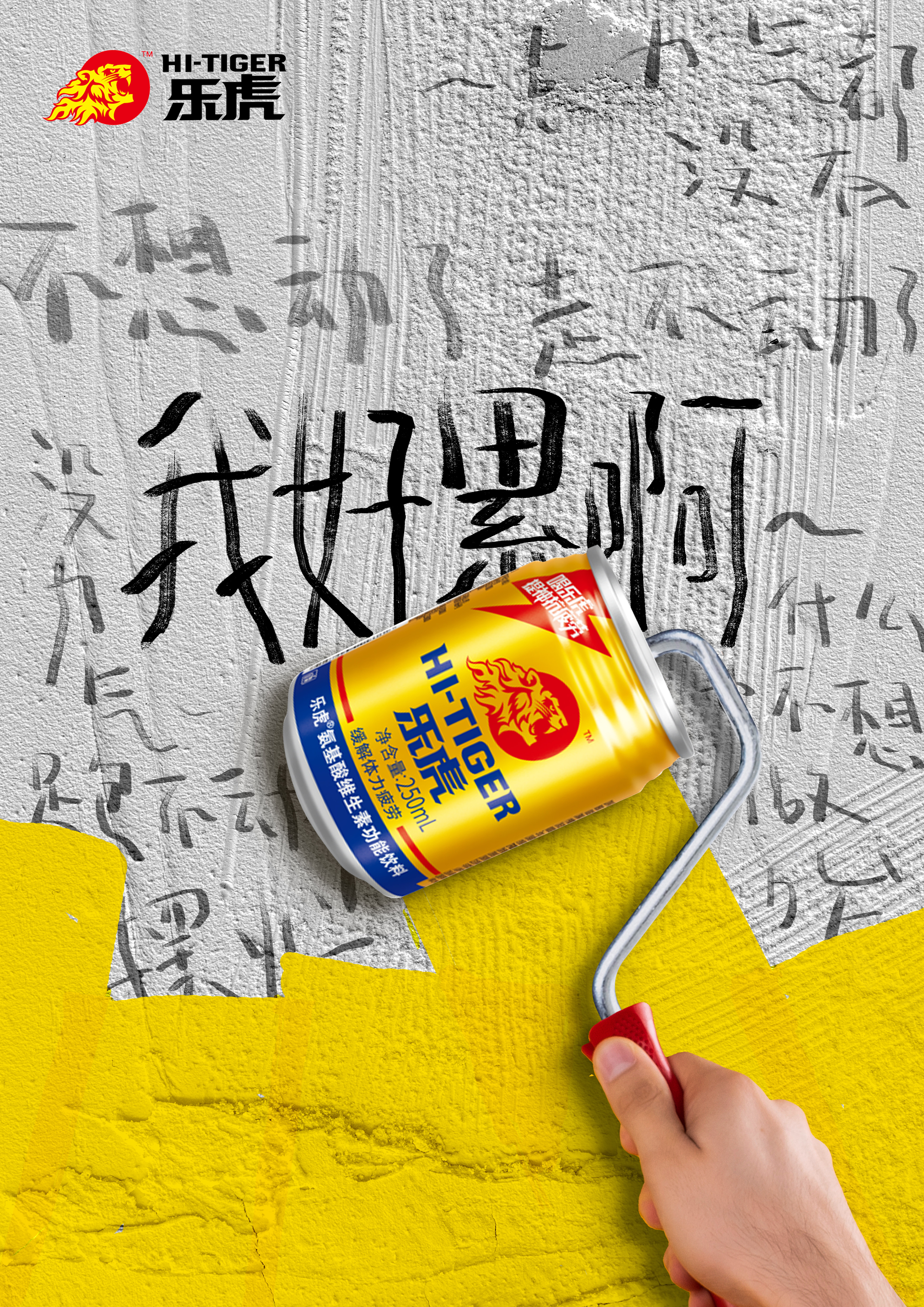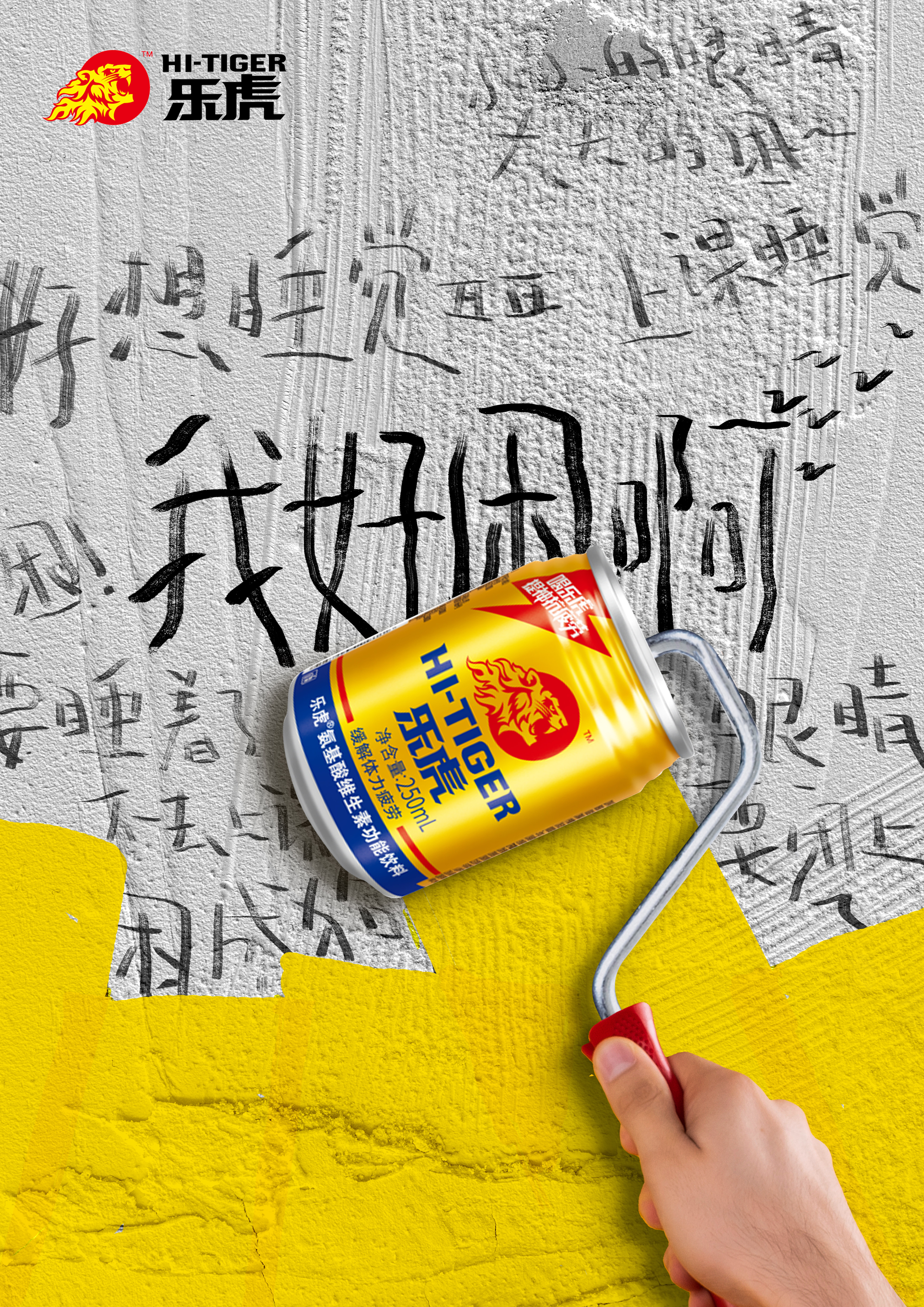 运用“置换”的手法,乐虎变成了一个滚筒刷子,墙壁上写着人们困累时的各种内心独白。画面中是手拿着乐虎来刷掉困累,意为乐虎可以轻松消除你的困累。