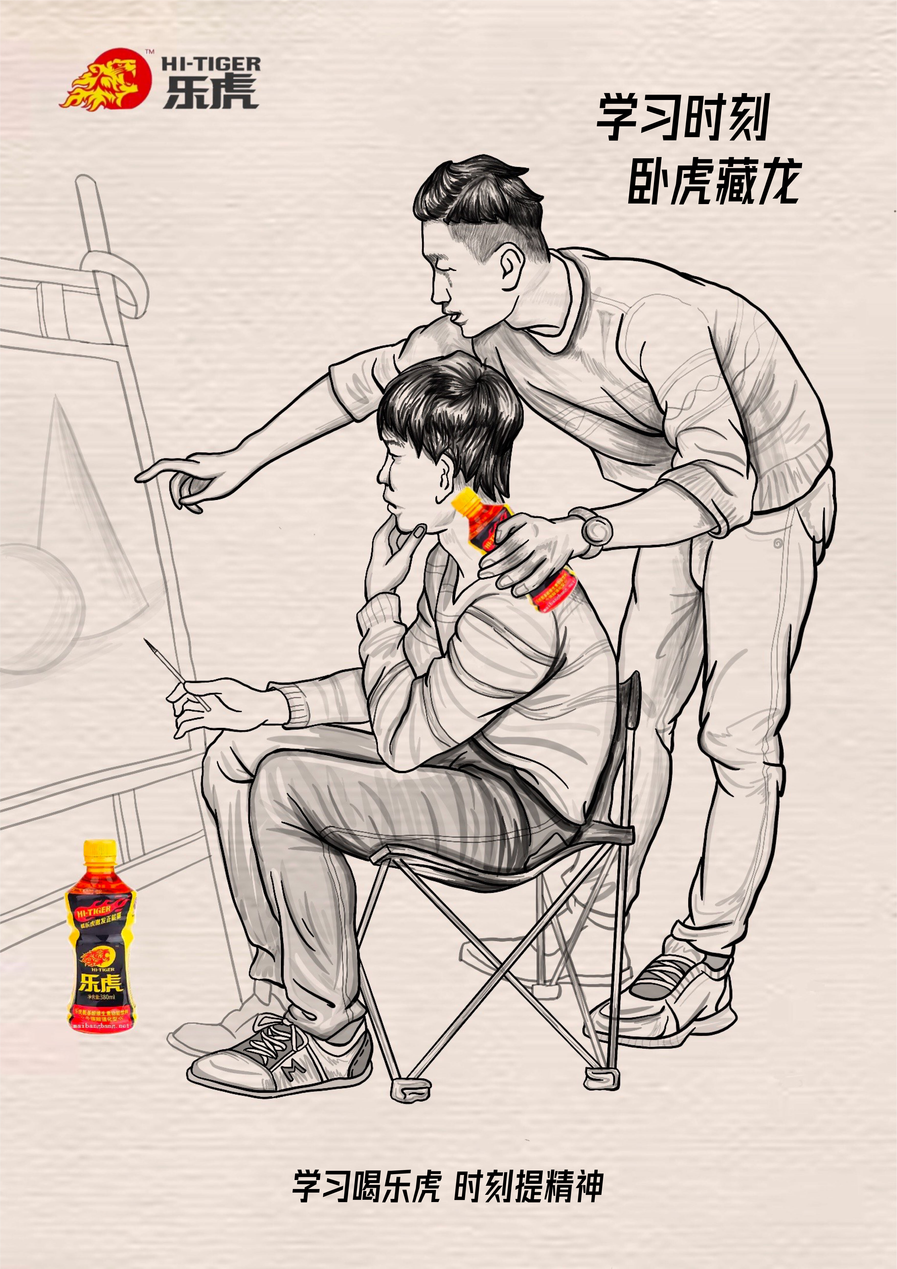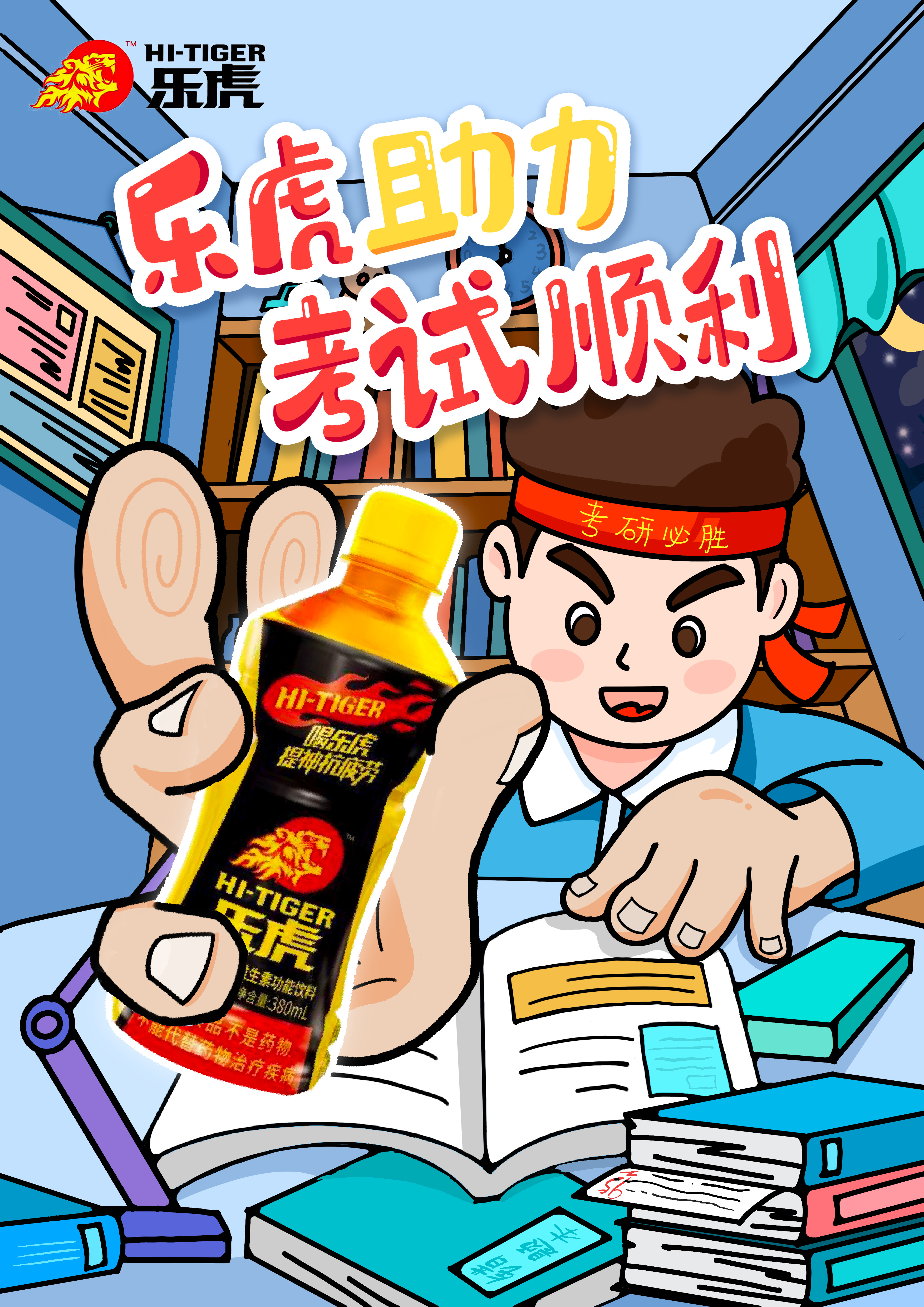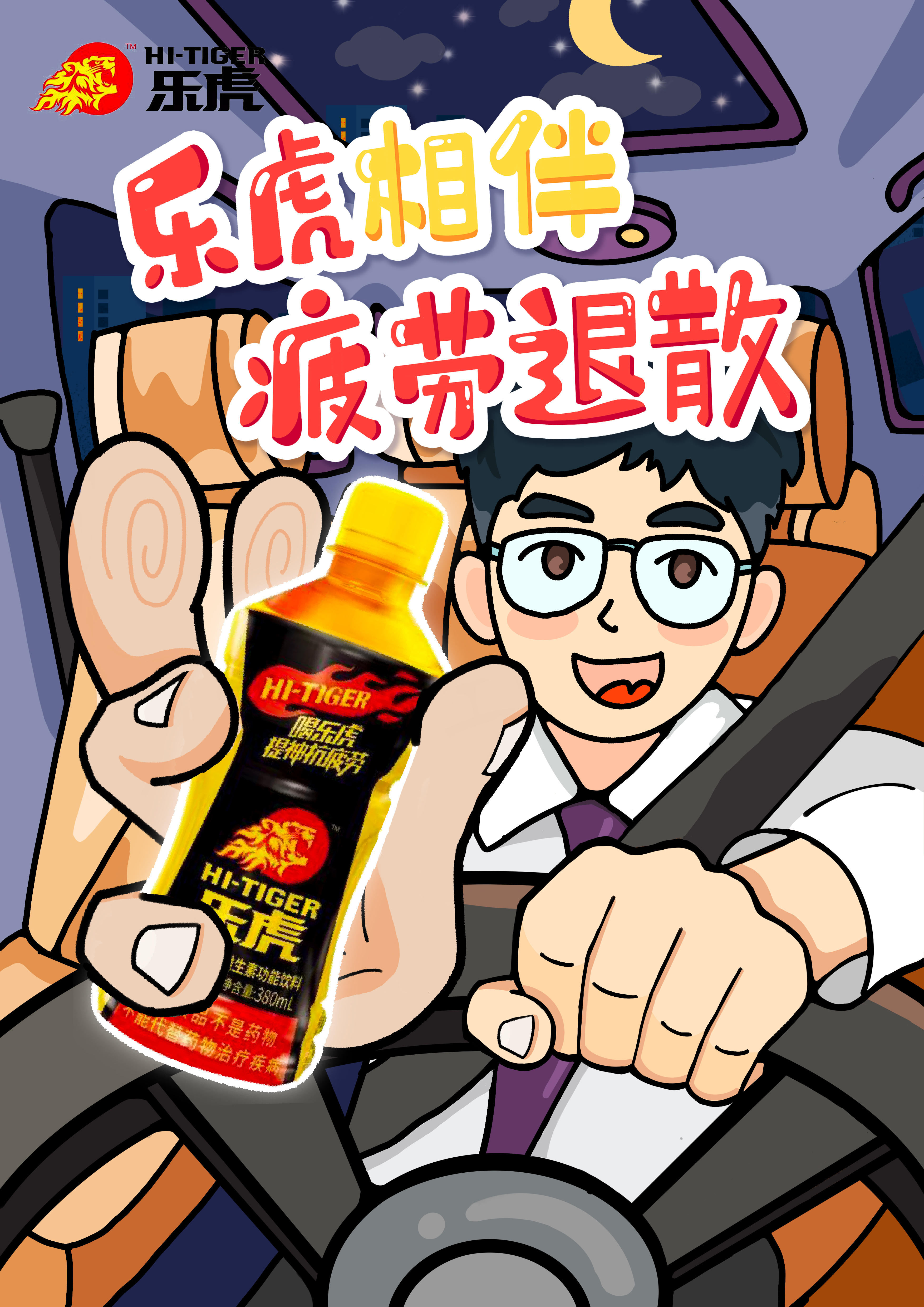 该作品是围绕着“累困喝乐虎、提神抗疲劳" 进行创作和设计的。 选用三个具有代表性的场景对产品的核心卖点进行表现,分别是熬夜学习、疲劳驾驶和熬夜打游戏的场景,非常贴合学生群体。在喝了乐虎的情况下也能精神百倍的去学习,开车和打游戏,从而体现出乐虎提神抗疲劳功能强劲,同样也是功能饮料的首选。
