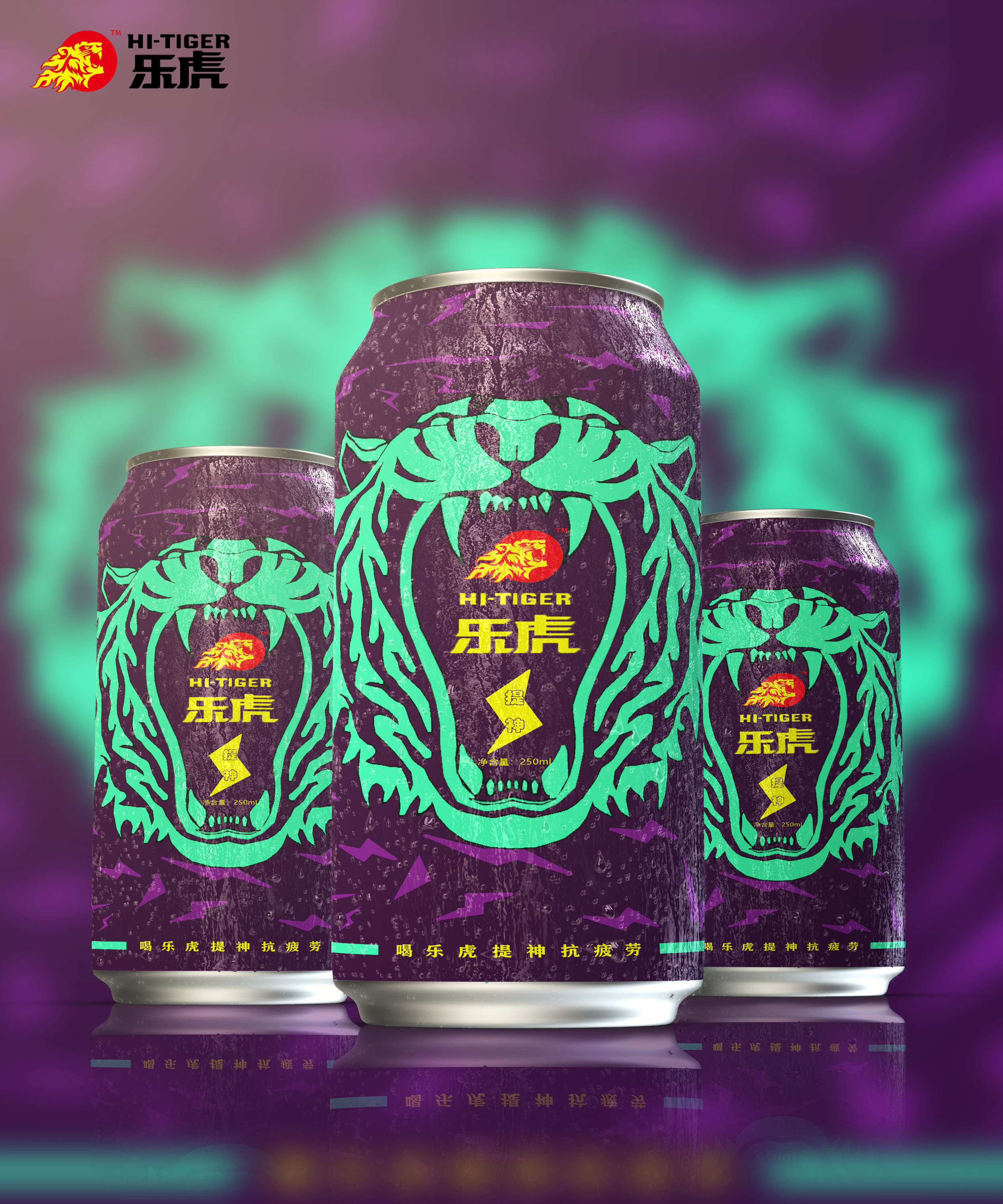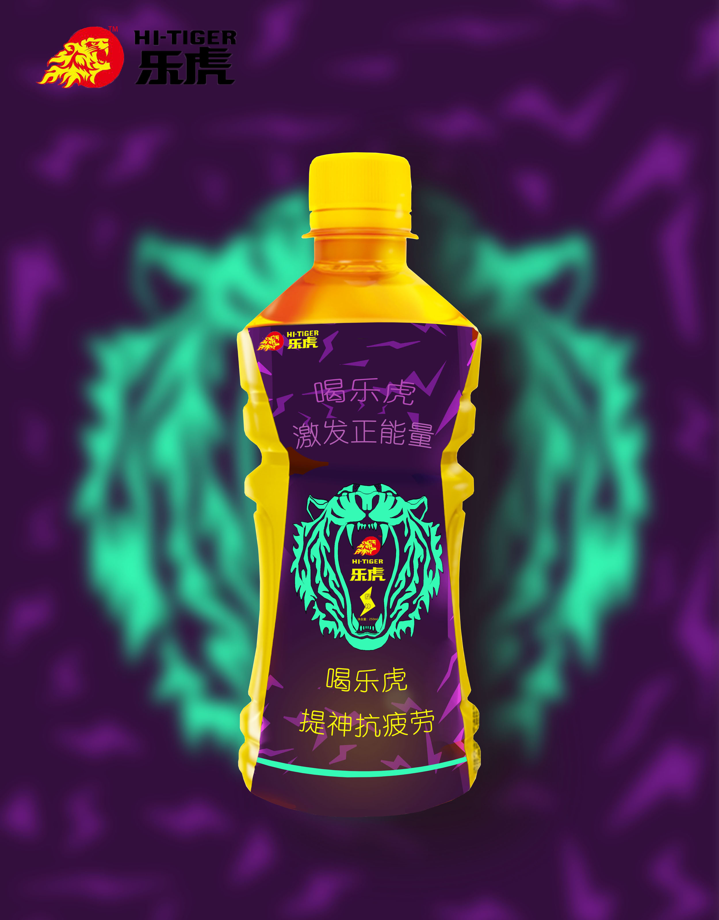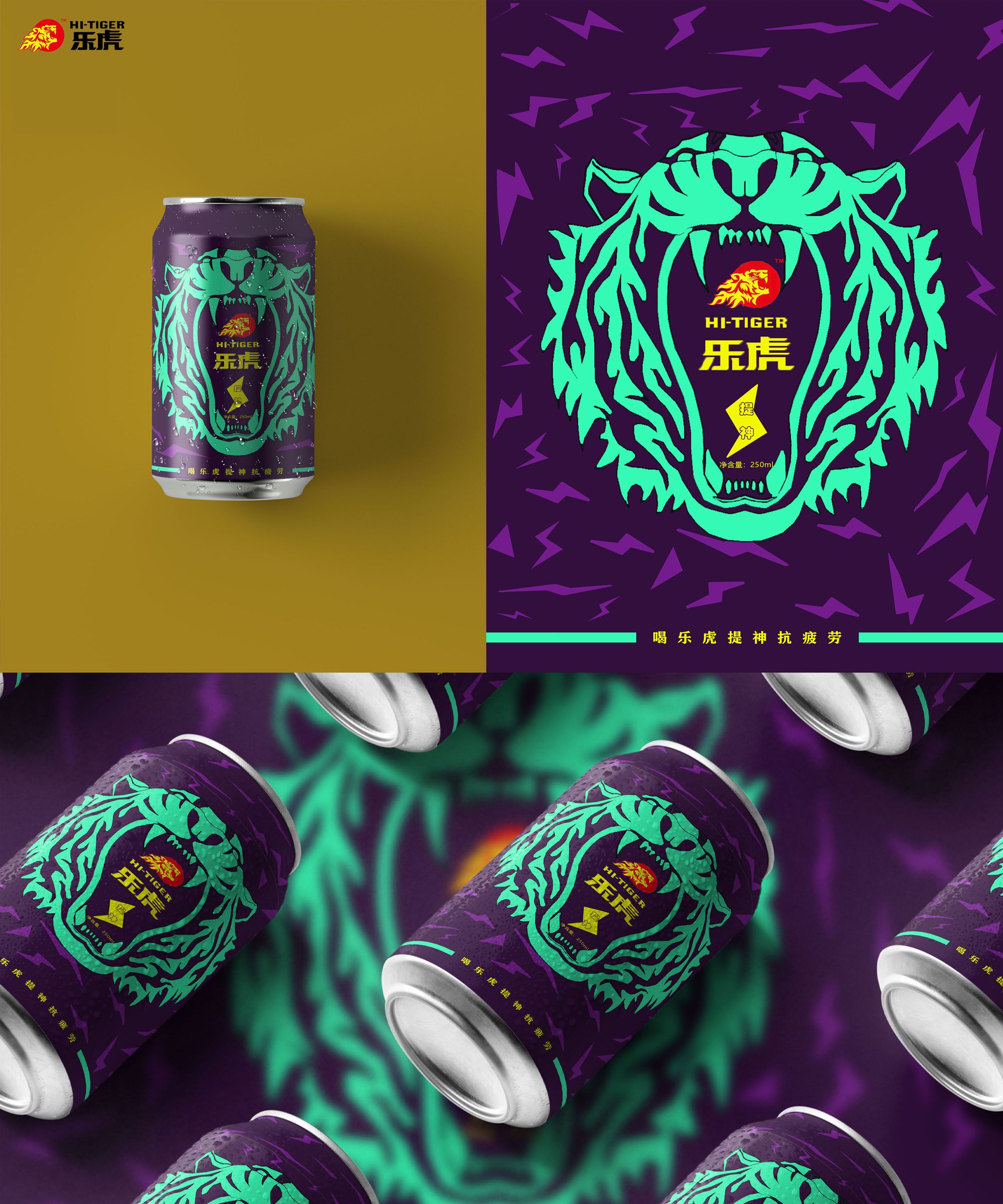 运用夸张手法描述虎头的凶狠面部,虎口采用闪电,来表达喝乐虎提高活力,快如闪电,摆脱困难。