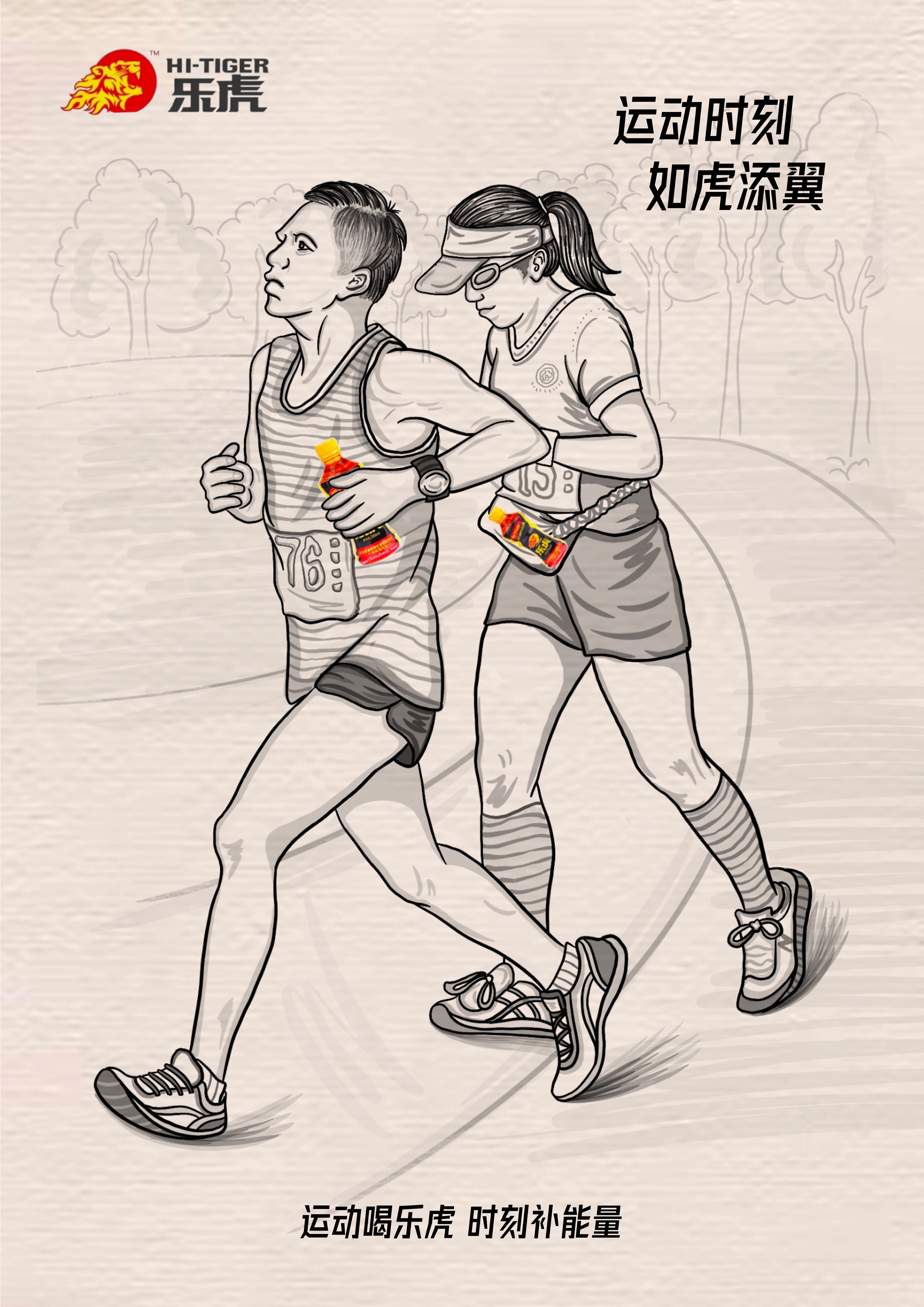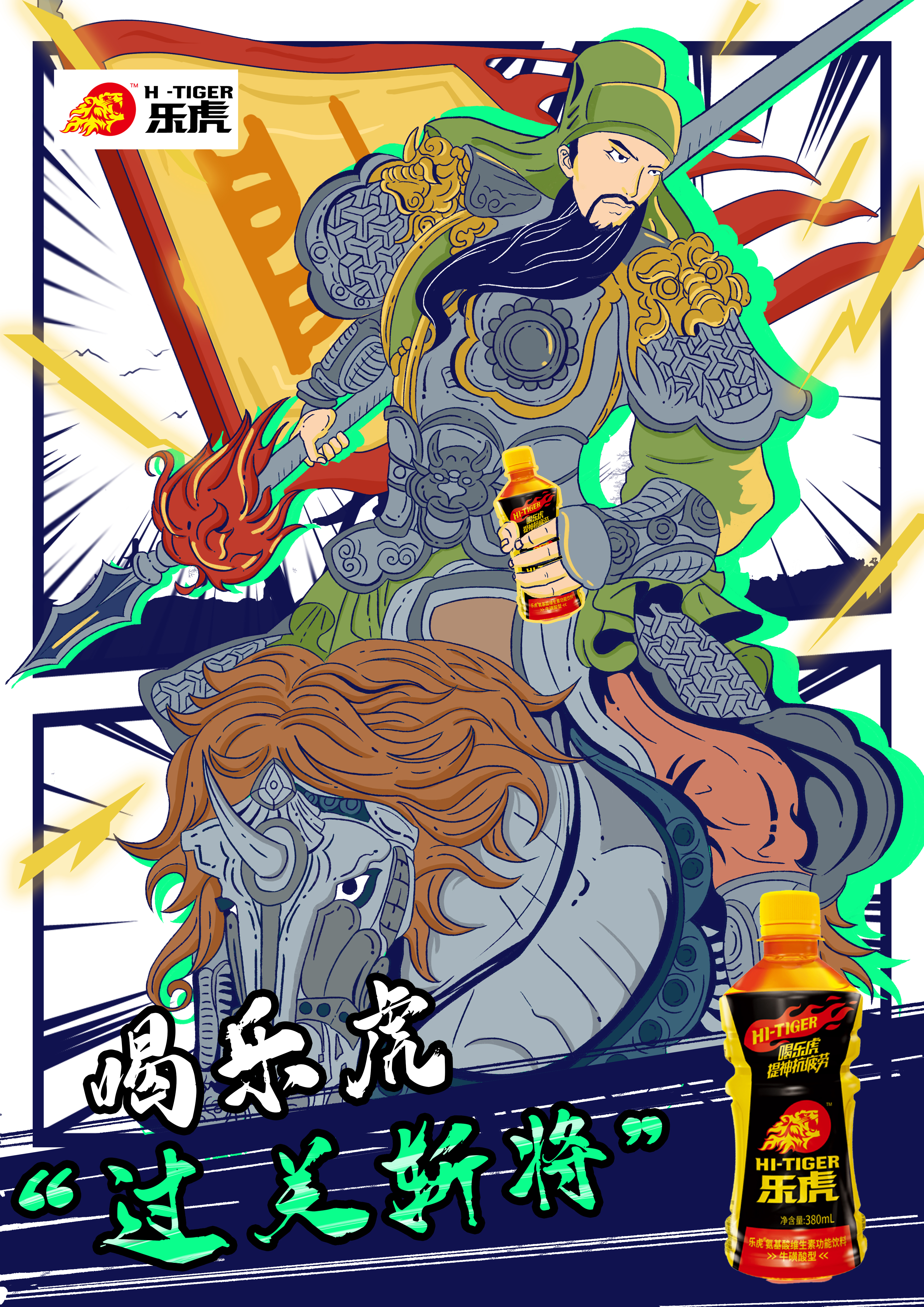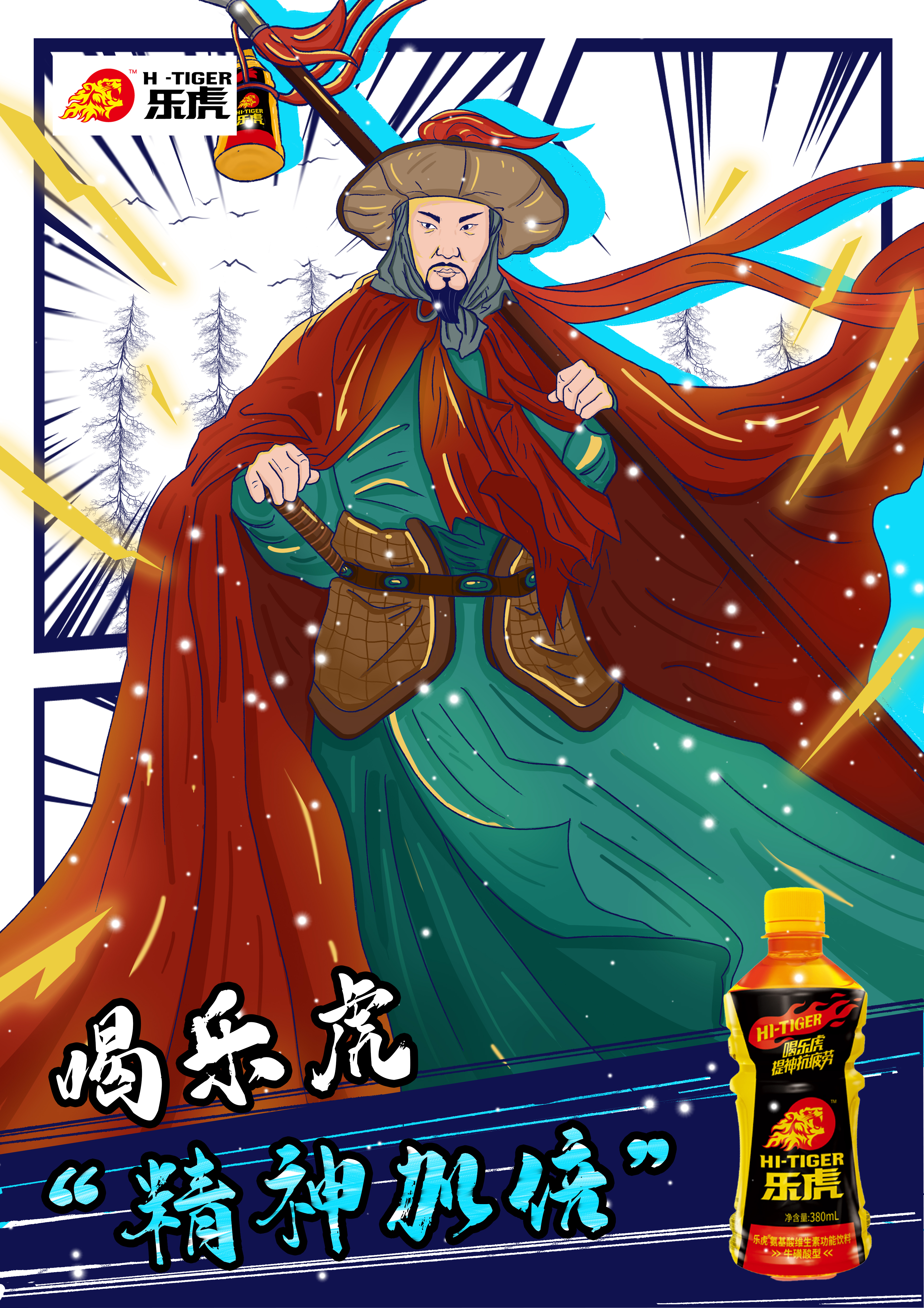 乐虎的整个品牌调性是挑战,个性,不服输,不畏惧,提供能量,本系列作品中采用插画的形式把乐虎与水浒传中的人物事迹结合,通过关羽的过关斩将、鲁智深的倒把垂杨柳和林冲的风雪山神庙的事迹,表现出乐虎给他们带来了无限的能量,在乐虎的帮助下他们突破自我,挑战极限。