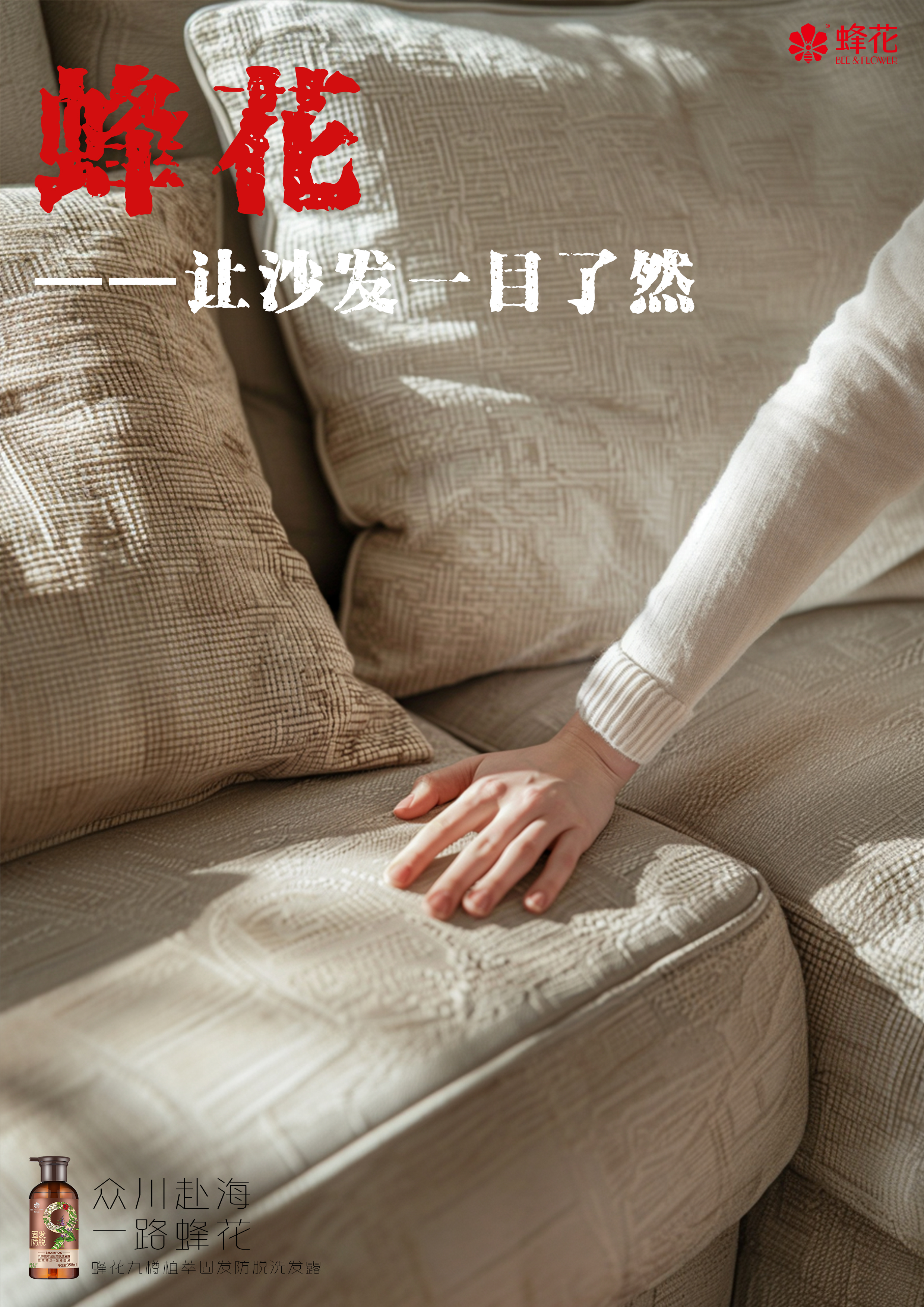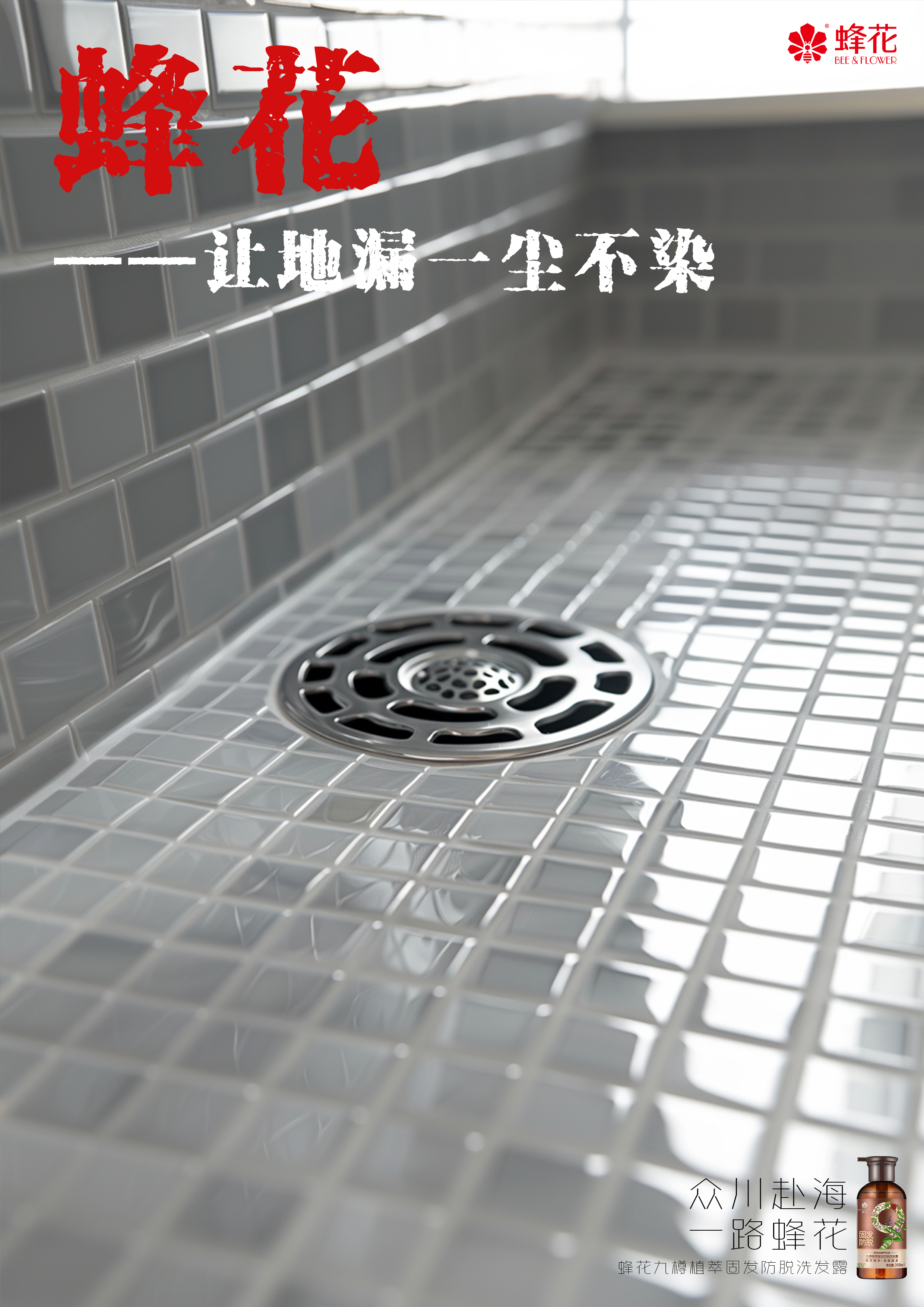 作品分别展示了一毛不拔的梳子,一尘不染的地漏和一目了然的沙发,说明用了蜂花固发洗发水之后家中干净的找不到一根头发,有蜂花就是这么干净。