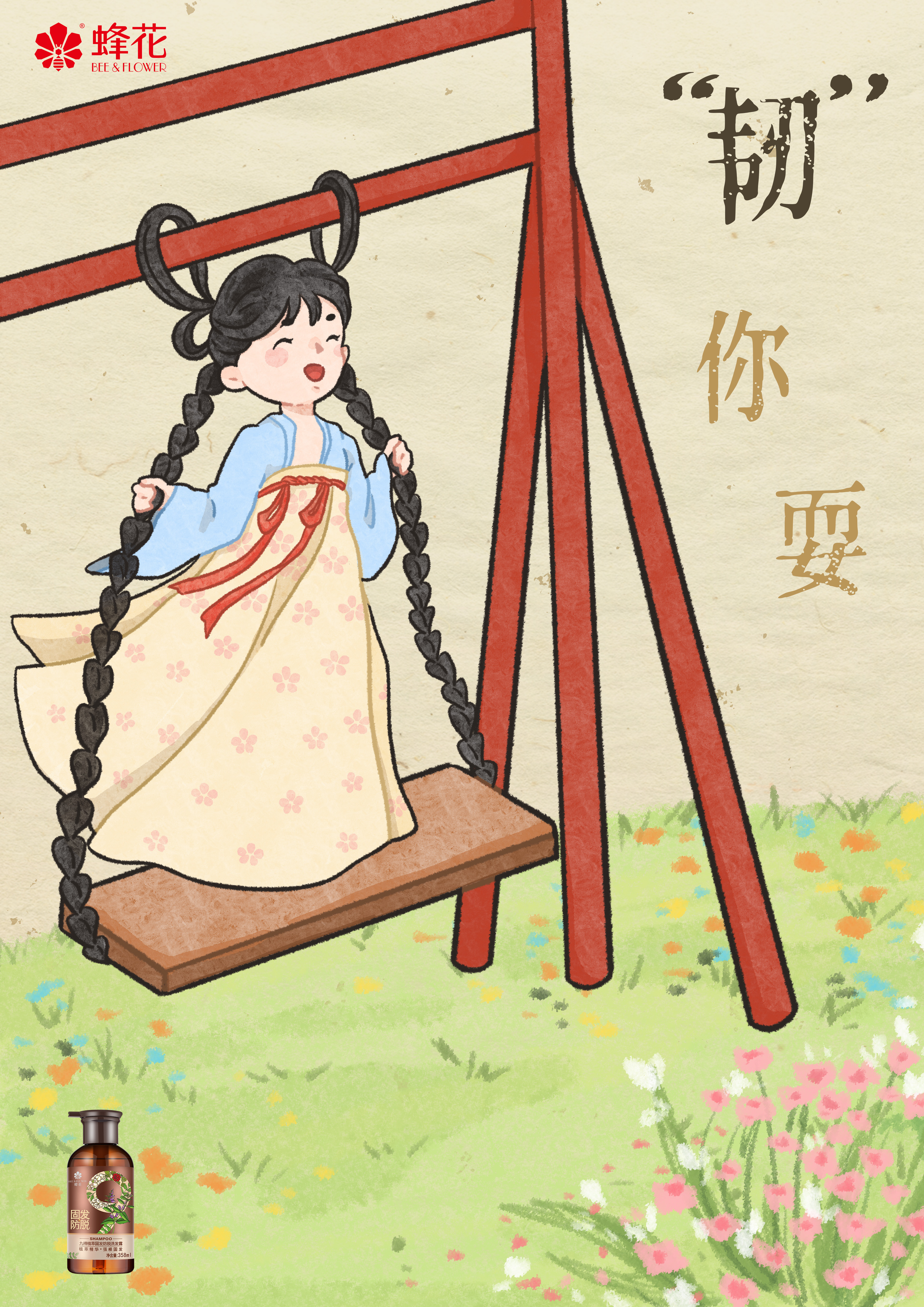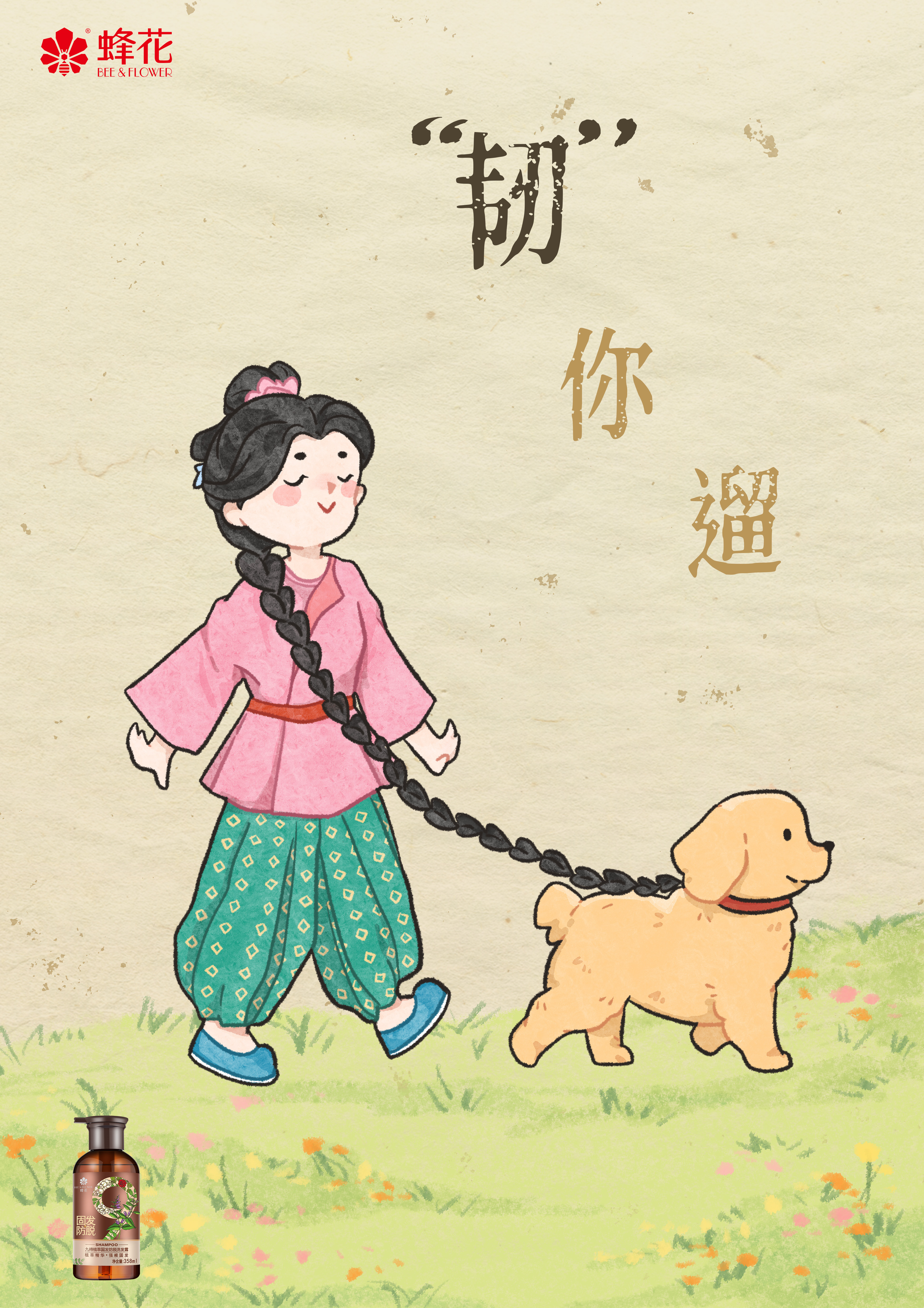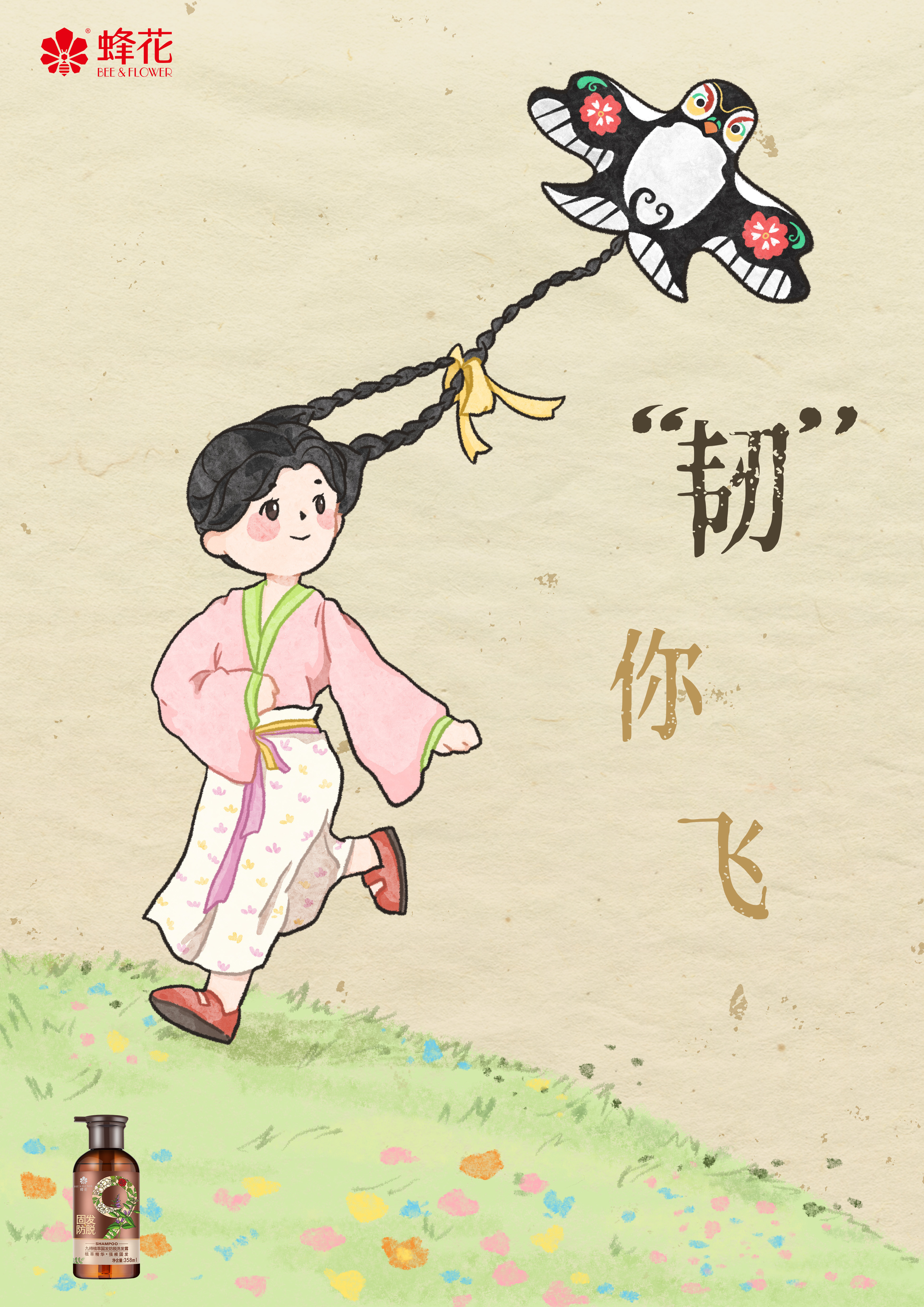 该作品是为蜂花九樽植萃固发防脱洗发露设计的平面海报。结合产品提升发丝韧性、强健发根、固发防脱的主推功效,作品中设计了荡秋千、放风筝、遛狗三个符合年轻人生活的趣味场景,以主体人物的头发作为秋千绳索、风筝线与牵引绳,意在表达使用蜂花产品后发根能够更加坚韧、强健,任凭各种外力拉扯。画面主体人物为身着汉服的年轻女生,易于为年轻人所喜爱和接受,为品牌注入新鲜活力,同时也意在传递蜂花作为国货品牌所构筑的文化认同,拉近与消费者的心理距离。同时,海报中的广告词以“韧”谐音“任”,也增添了趣味性,增强对消费者的吸引力。