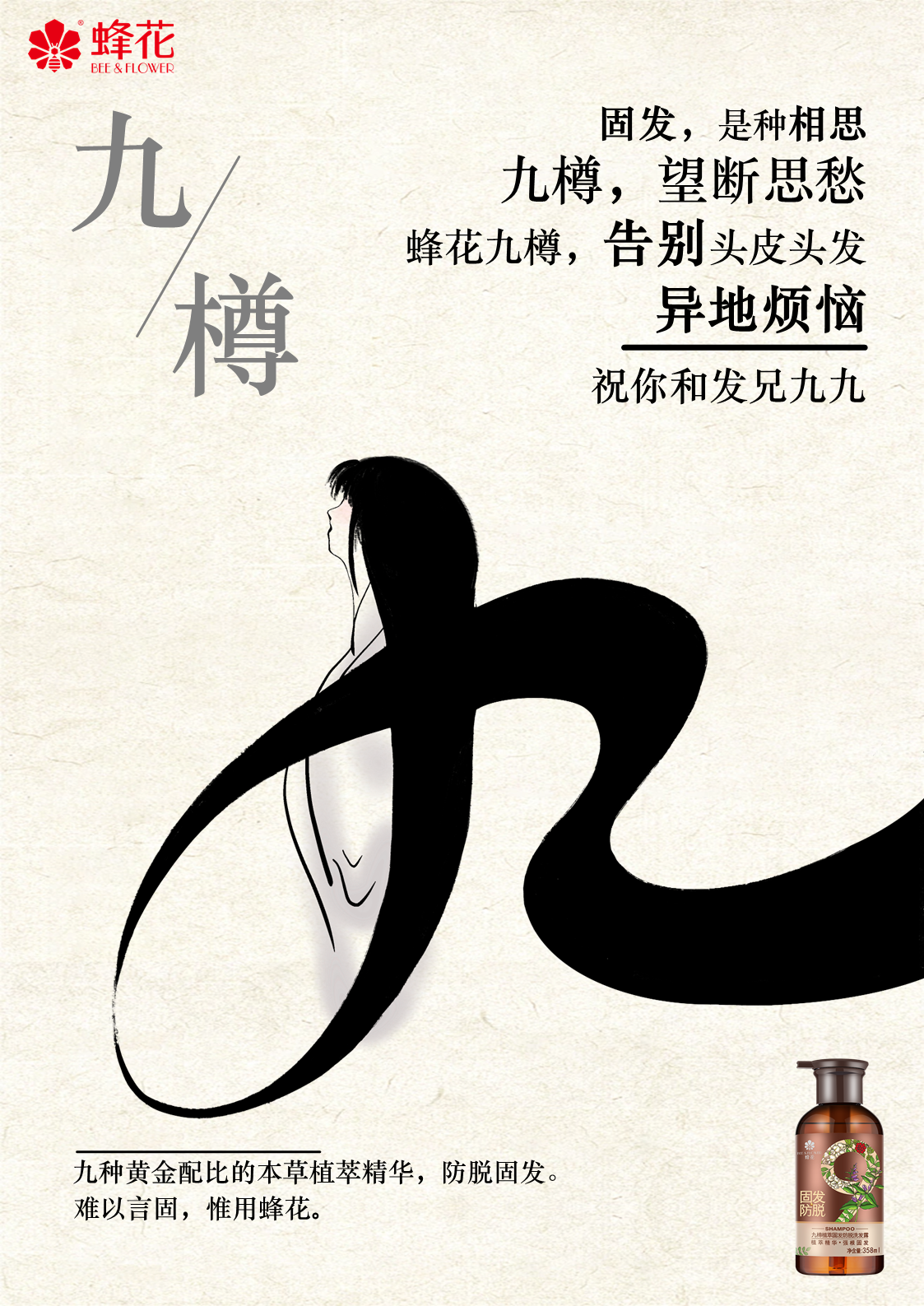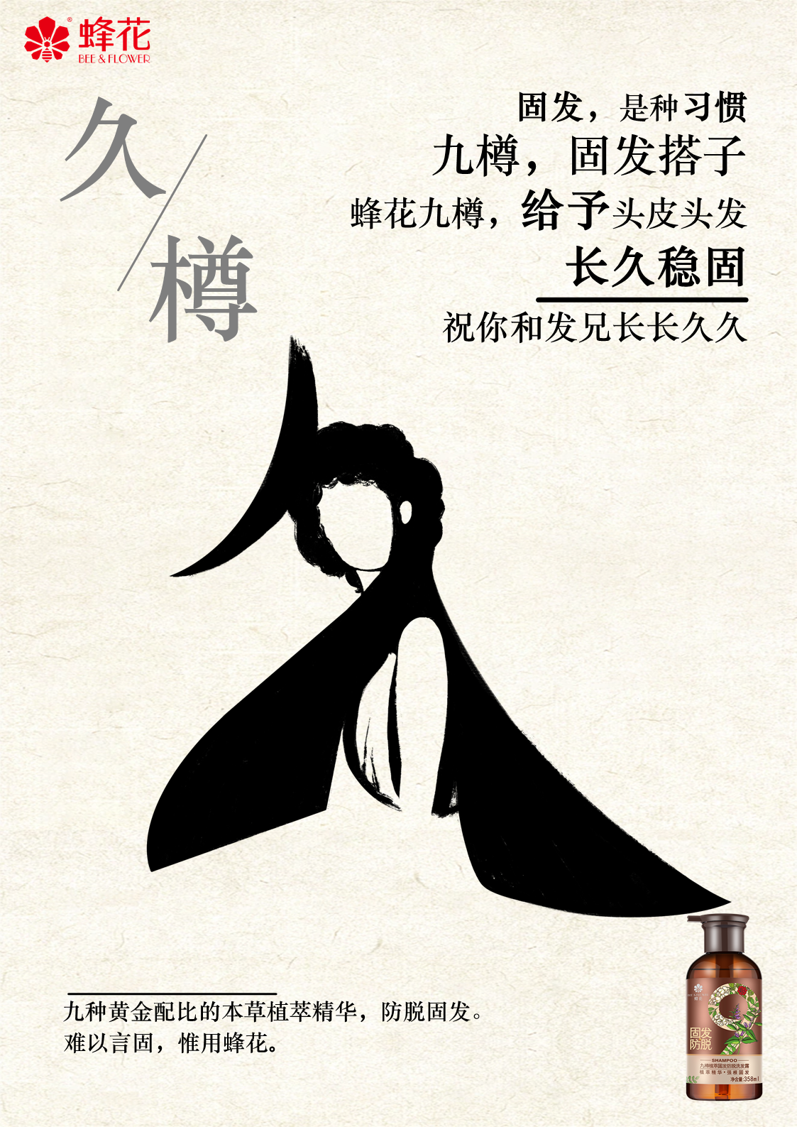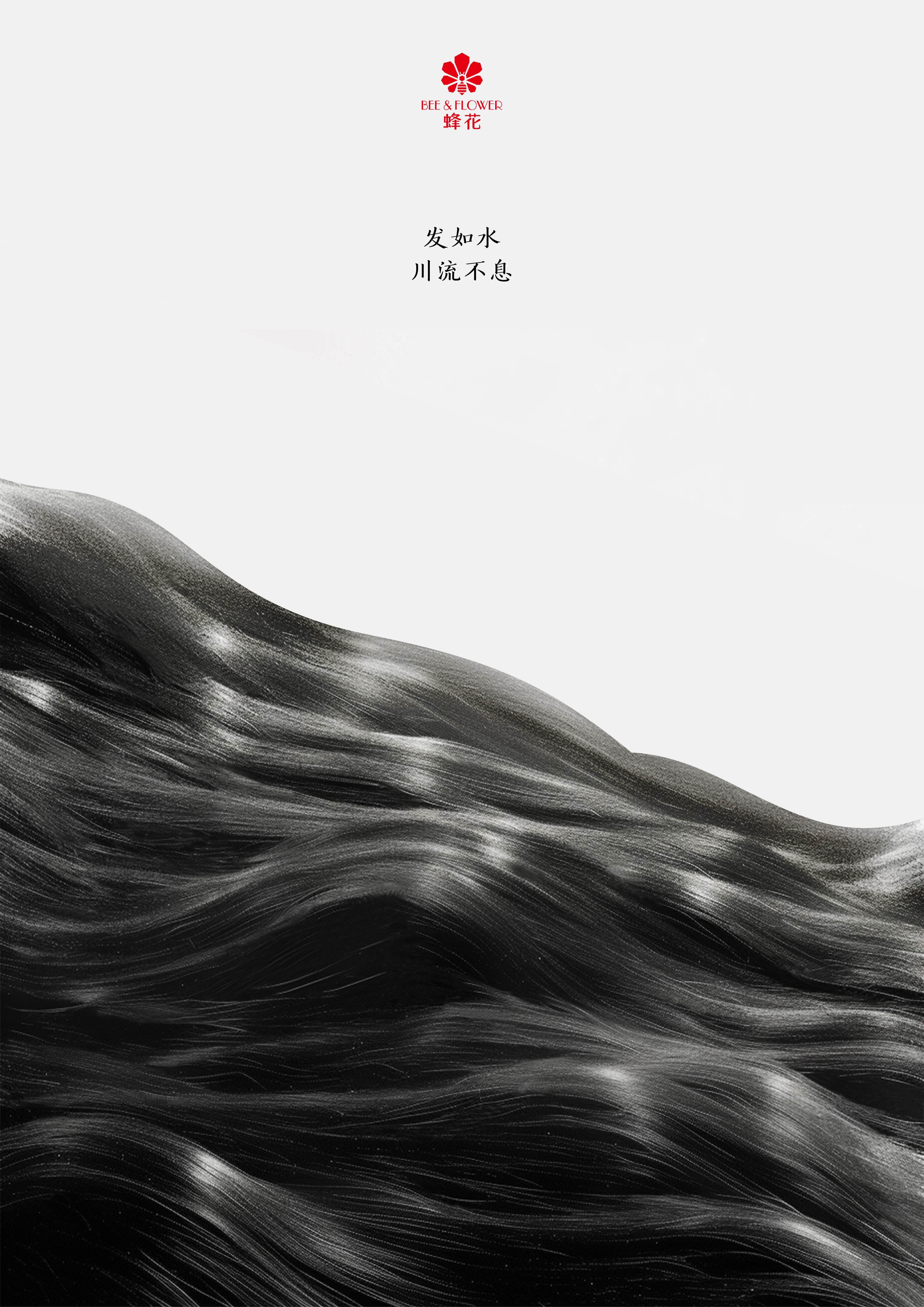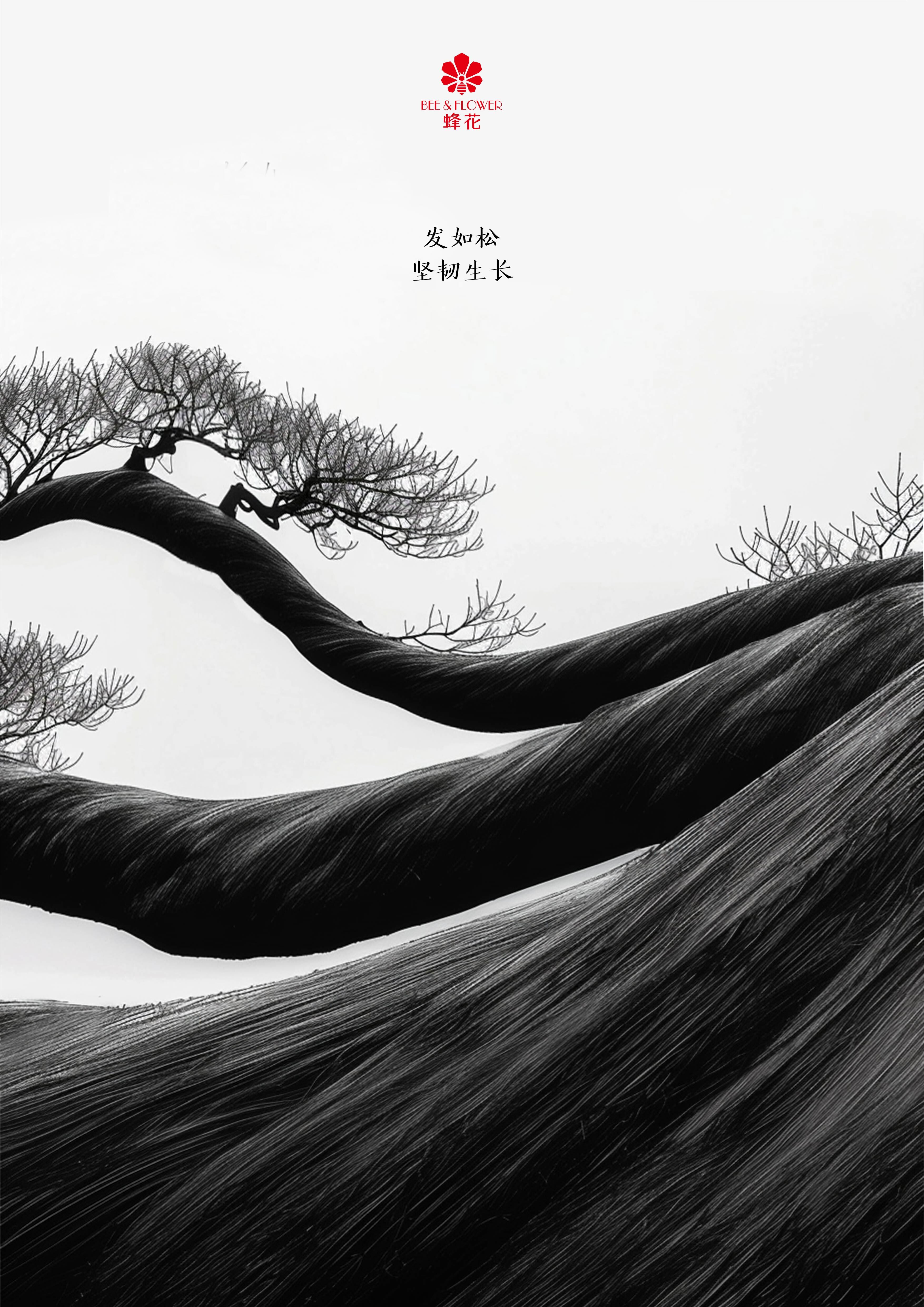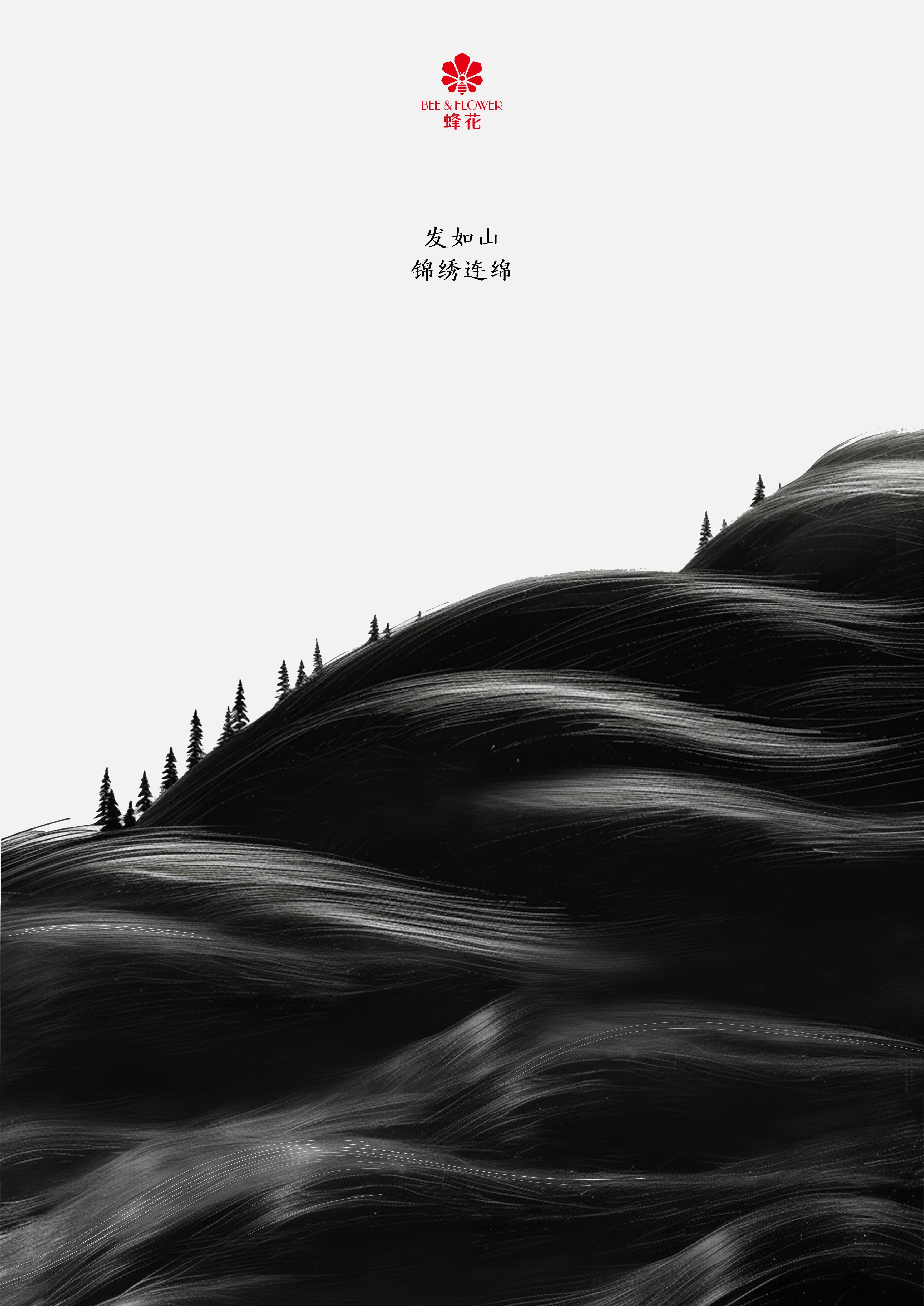根据蜂花九樽植萃固发防脱洗发露的品牌诉求,采用了“发如松”“发如山”“发如水”的思路,把用过蜂花洗发露的头发比作坚韧的青松、锦绣连绵的山、川流不息的水,契合蜂花洗发露的防脱效果,山水松的自然意象更加符合蜂花九樽植萃的品牌调性。
