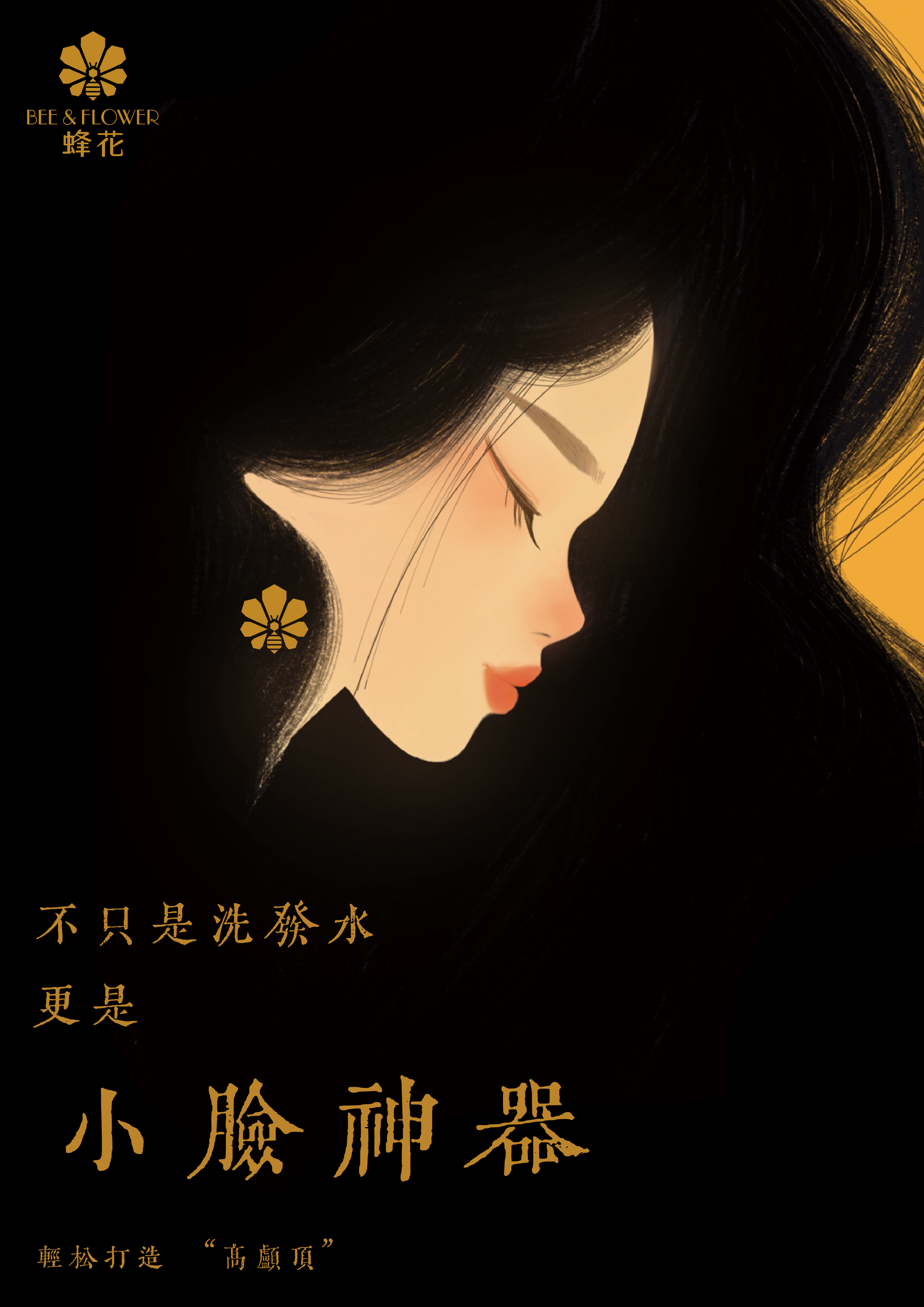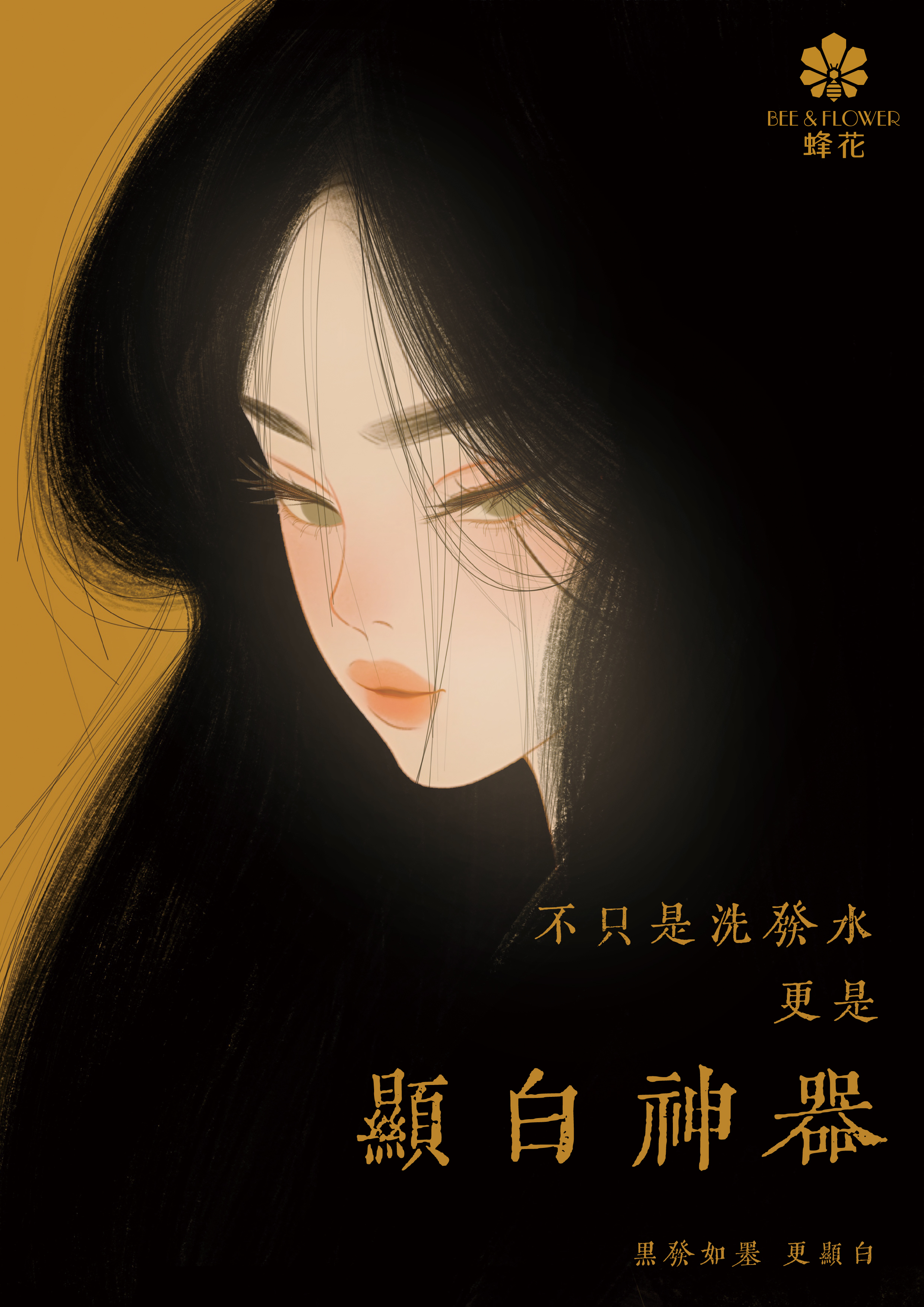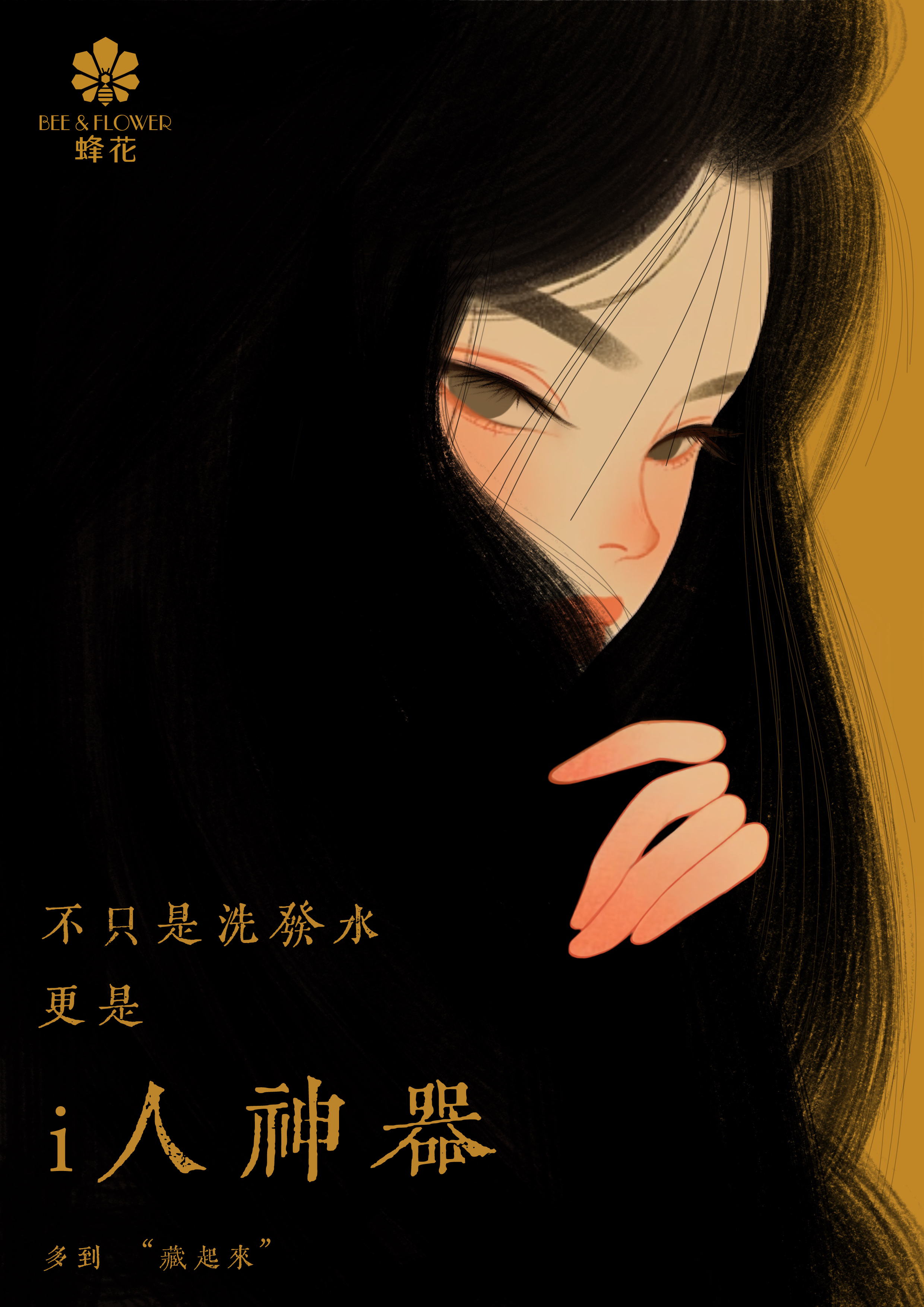 作品以插画性质强调了蜂花产品蓬松、黑亮、固发生发等卖点,头发蓬松则显得脸小,迎合当代年轻人对“高颅顶”和”氛围感“的追求;固发防脱的产品特性通过发量大到可以把人“藏起来”,迎合当下mbti人格测试的热潮,精准抓住目标客群的注意力和需求;皮肤在乌黑油亮的秀发的对比下会显得更加白皙,通过直观的展示产品功效来激发目标客群的购买意愿。画面以古典女性的黑发为主,色彩以简洁的黑色和黄色为主,对比鲜明突出了秀发的存在感,使观者进一步自发理解到蜂花产品的种种功效,达到“润物细无声”的效果。
