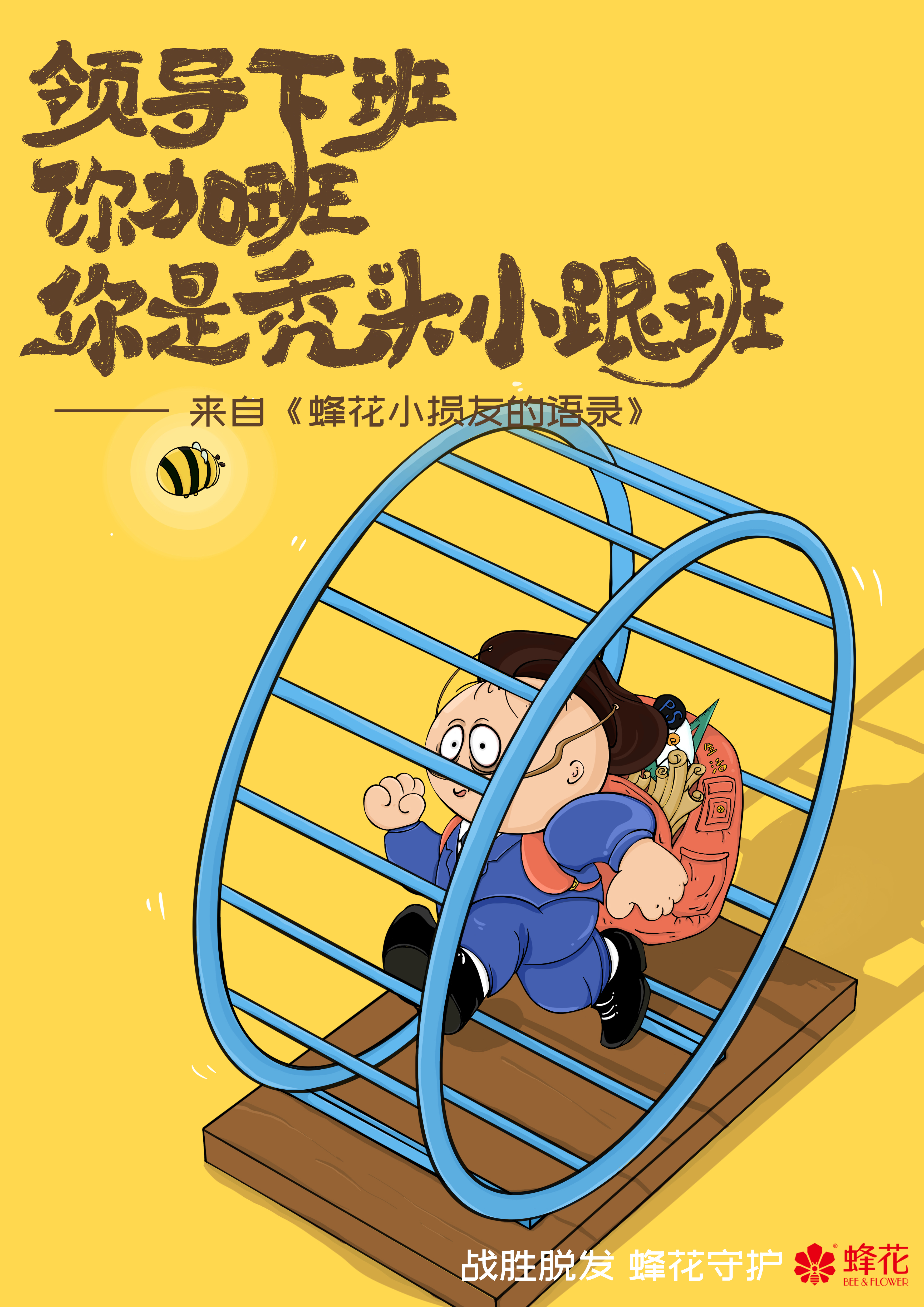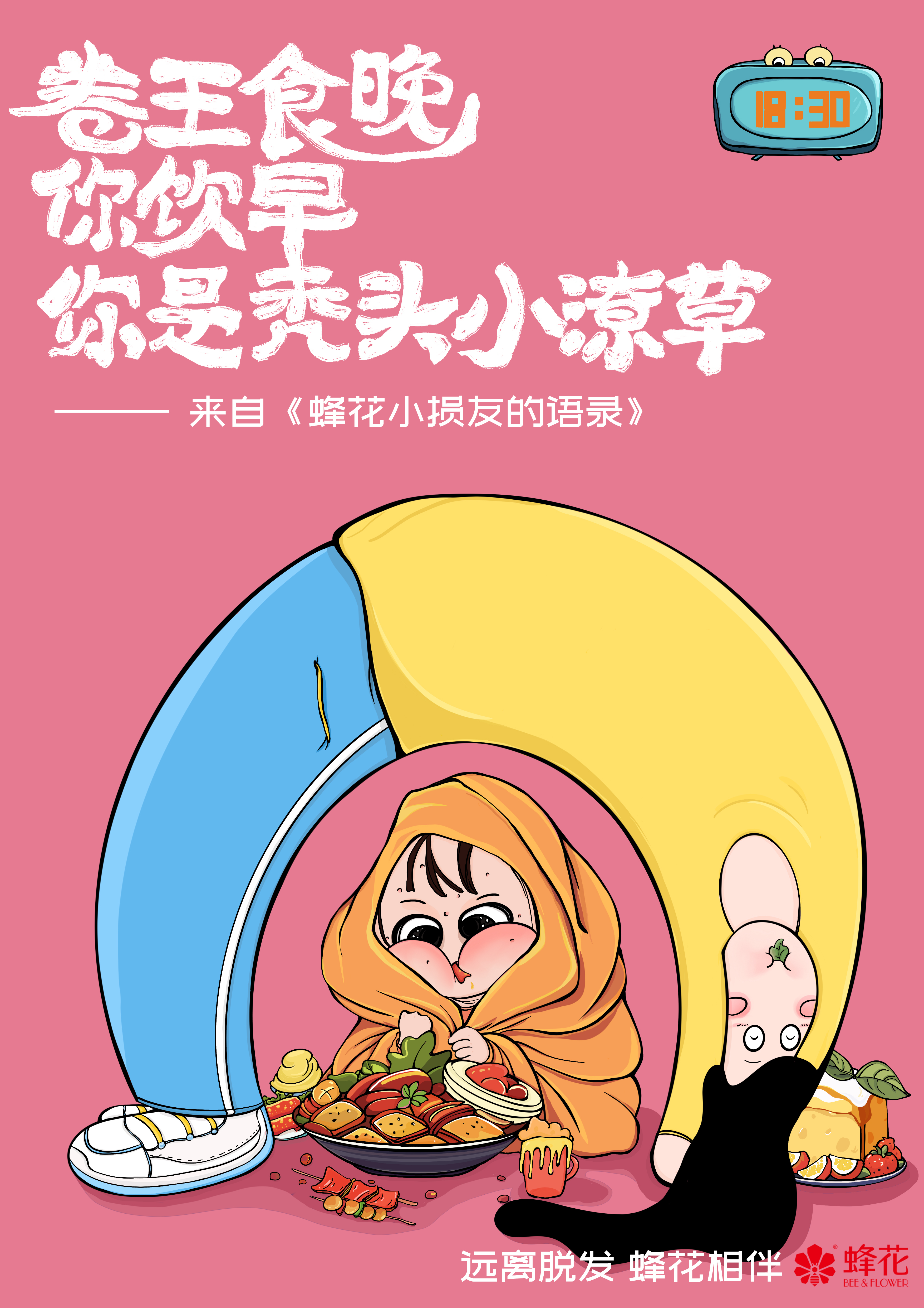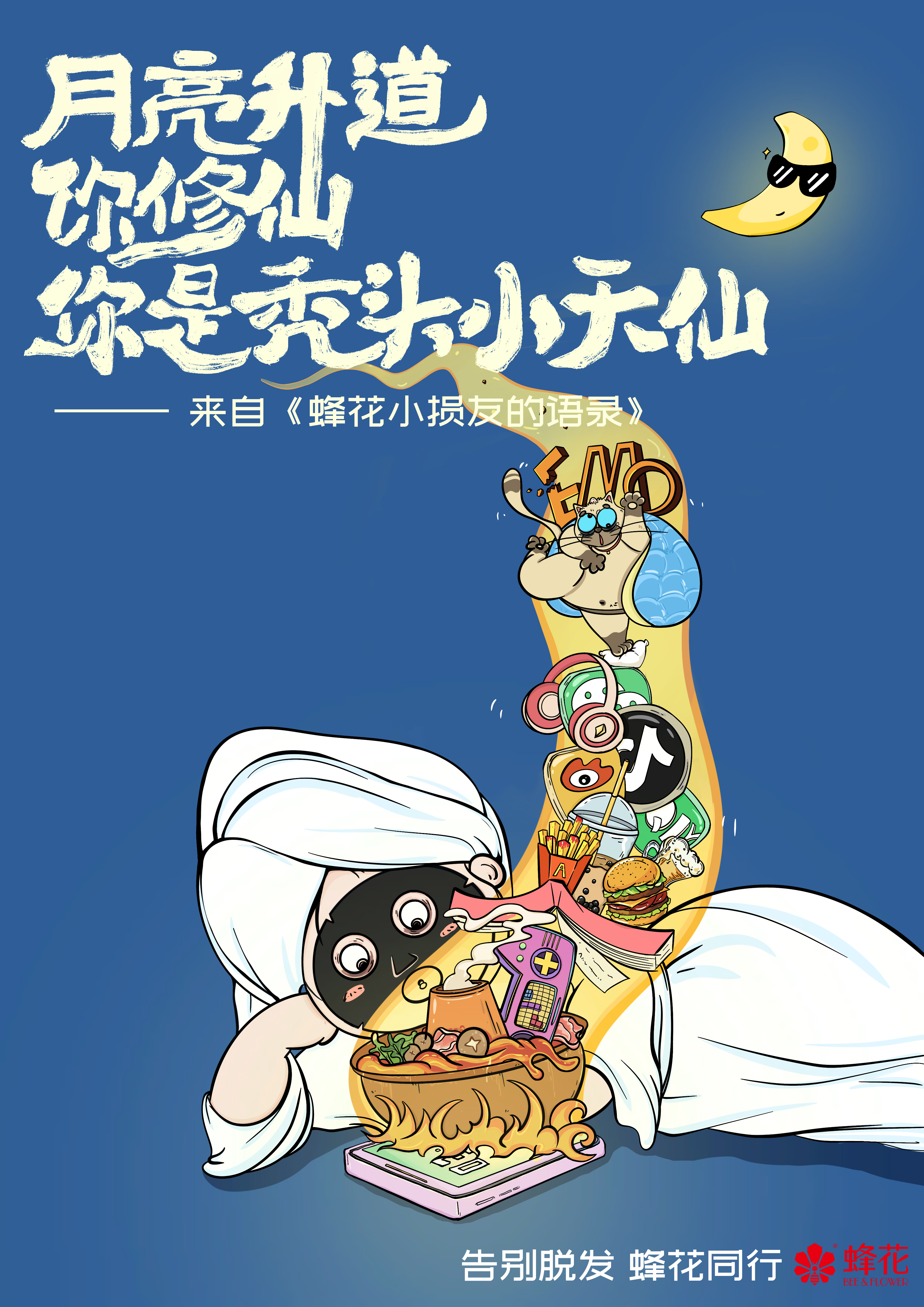 从消费人群痛点出发,将蜂花拟人化,以损友的口吻通过与月亮赛熬夜、与领导对比加班状态、与卷王相较饮食规律性来劝慰经常因通宵修仙、熬夜加班、饮食不规律而脱发的人群,以幽默可爱年轻化的方式来突出国货蜂花九樽植萃固发防脱洗发露“防脱发”的产品特性。