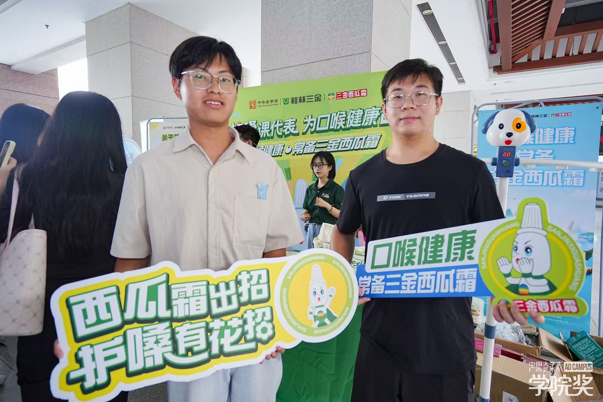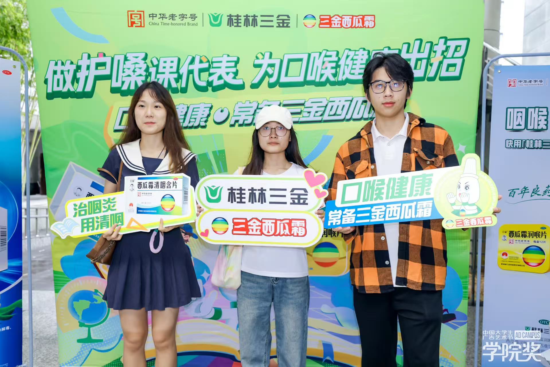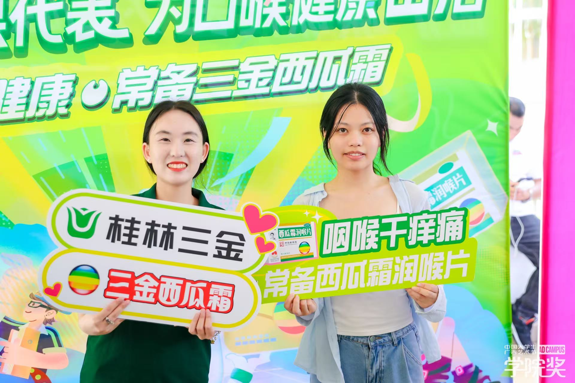 不同会场,同样有趣!为打造与学子们更沉浸式的互动体验,三金西瓜霜在三所高校均设置了品牌专属的互动展区。这里不仅陈列着产品实物供学子们零距离了解,更设有趣味互动装置和创意拍照打卡点,吸引了众多同学驻足参与,欢声笑语不断。