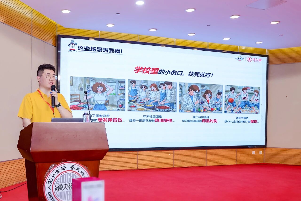 创意课堂上,达仁堂品牌方代表以“一抹京万红,愈合更从容”为主题展开演讲,从药物机理到使用场景,结合真实案例深入浅出地阐释了京万红软膏在日常防护与应急处理中的实用价值,引导学生打破对中医药的认知局限。
