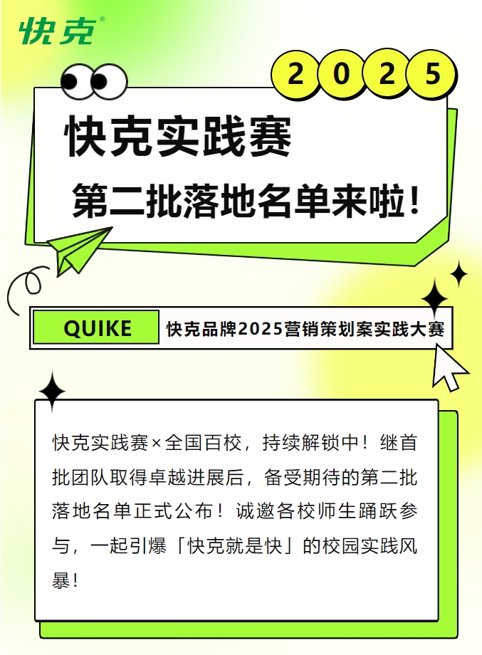上抖音、微博、小红书,搜索话题#快克就是快,解锁更多大赛精彩内容!10月11日-11月20日,【快克就是快】校园快闪互动即将登陆以上高校,千万别错过这场惊喜邂逅,“快”赢取周边好礼!