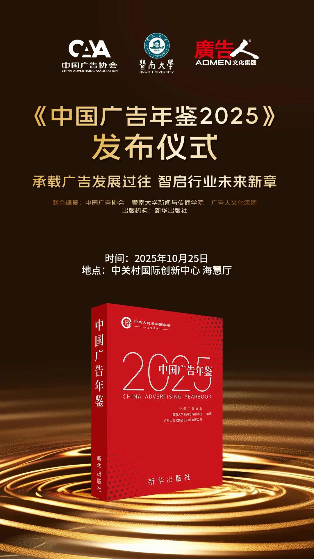 《中国广告年鉴(2025)》将于2025年12月由新华出版社正式出版,面向全国开启预征订。届时,中国广告协会、暨南大学新闻与传播学院、广告人文化集团将联合出版社,图书平台、行业媒体,行业协会建立多渠道发行网络,方便购书。