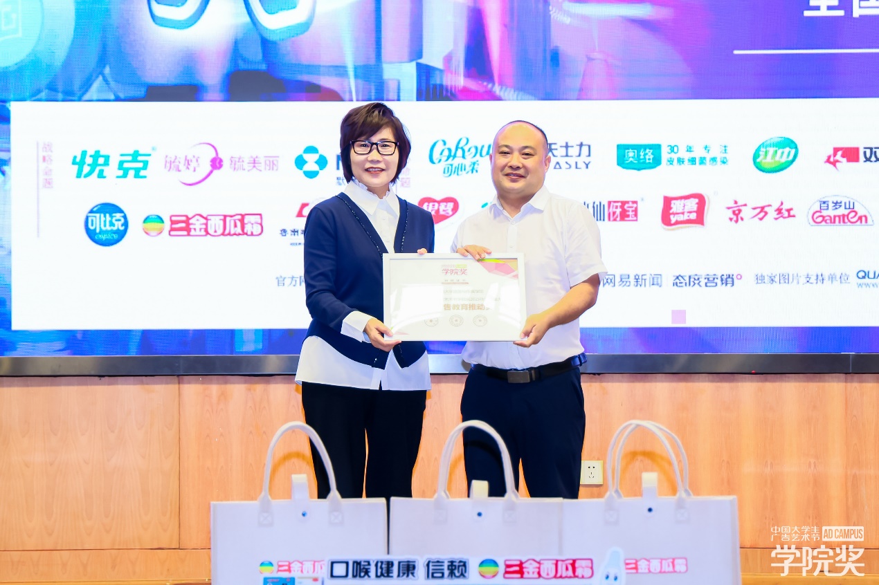 随后,由重庆交通大学旅游与传媒学院樊信友副院长代表学院领奖,以此表彰学校在推动产教融合、培养创新型人才方面所做出的杰出贡献,袁健女士代表组委会,向重庆交通大学旅游与传媒学院颁发“学院奖2025秋季征集大赛·广告教育推动奖”。