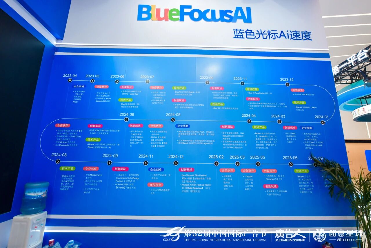 侧面展墙展示了蓝色光标从2023年正式发布 “AI² 战略”后短短两年多时间,在技术、创意、生态的多维赛道上全速奔跑的历程,每一个时间节点的突破,都是其重塑行业格局的有力注脚。