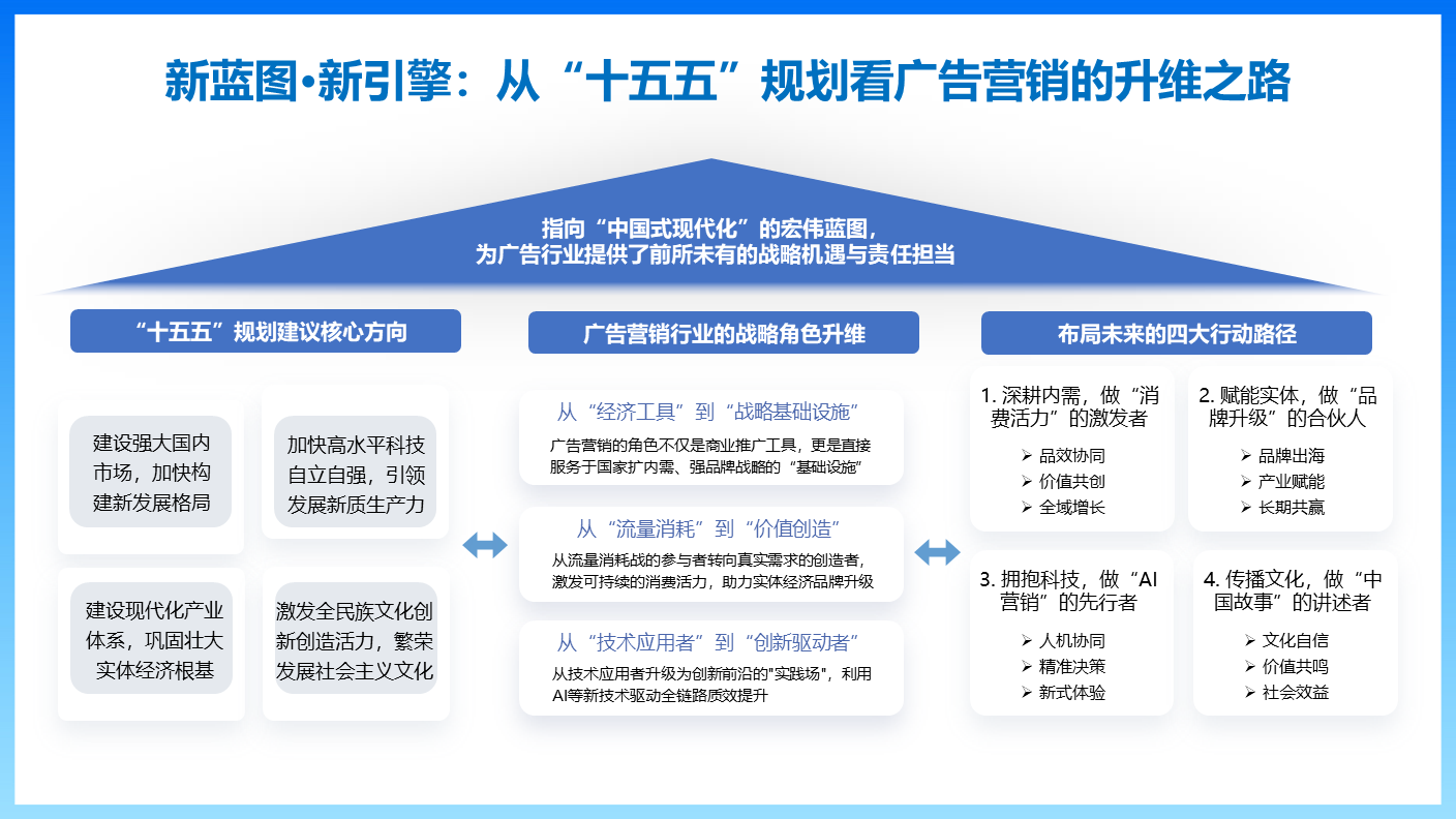 面向“十五五”,面向“中国式现代化”的宏伟蓝图,广告营销的升维正面临前所未有的战略机遇。在角色上,广告营销行业是从“经济工具”到“战略基础设施”、从“流量消耗”到“价值创造”、从“技术应用者”到“创新驱动者”。