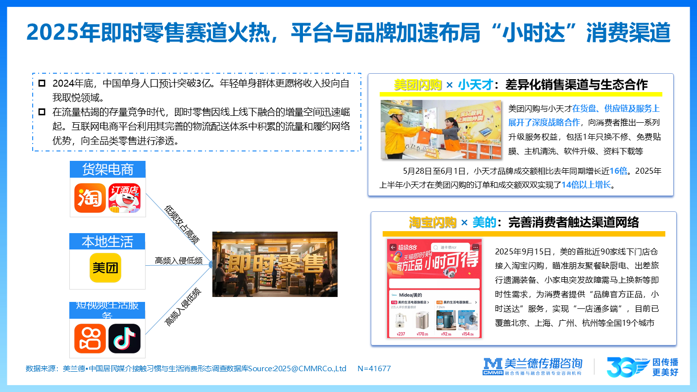 从传播渠道变化来看,用户注意力被严重分割,广告渠道及触达效果碎片化加剧信息鸿沟,网络连接形态正在加速复合型的传播场域空间形成。此外,在消费渠道变化中,即时零售赛道火热,货架电商、本地生活、短视频平台与品牌加速布局“小时达”消费渠道。如美团闪购与小天才在货盘、供应链及服务上展开了深度战略合作;近期美的首批近90家线下门店仓接入淘宝闪购,目前已覆盖北京、上海、广州、杭州等全国19个城市。