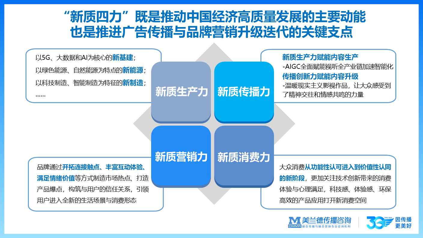 崔燕振先生提出:新质生产力是引擎,传播力是翅膀,营销力是舵手,消费力是燃料。四力协同,才能让品牌穿越周期,从“商业符号”升维成“精神图腾”。从新质生产力的崛起,到新质传播力的拓展,再到新质营销力的驱动,以及新质消费力的释放,这“新质四力”宛如一组强劲的引擎,不仅构成了支撑中国经济高质量发展的关键动能,也勾勒出媒体传播及品牌营销领域的核心主线。在当前充满变化和不确定的市场环境中,它们更是成为了媒体与企业探寻确定性未来的有力抓手。