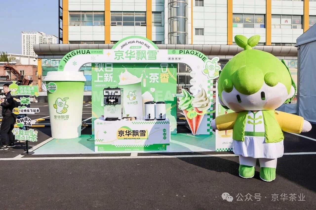 (活动现场“京华飘雪”茶饮体验区及“京小华”IP形象互动人偶)