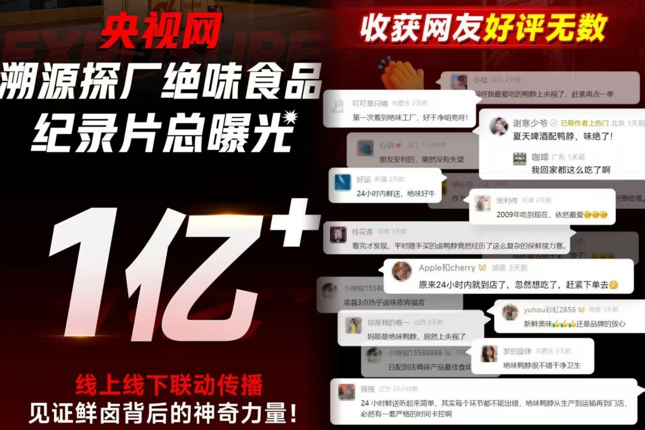 为进一步夯实“新鲜、安全”的核心心智,绝味品牌团队联合了国家级权威媒体“央视网”,共同策划了《鲜卤的24小时竞速》溯源纪录片 。影片首次将镜头深入绝味的智能工厂、冷链物流和终端门店 ,将枯燥的供应链优势转化为消费者可视化的“信任状”,该纪录片最终实现了超1亿次的曝光 ,有力地回应了夜宵场景下消费者对“新鲜”和“安全”的深层渴望,成功将“冷链保鲜 日配到店”的品牌心智烙印与绝味牢牢绑定。