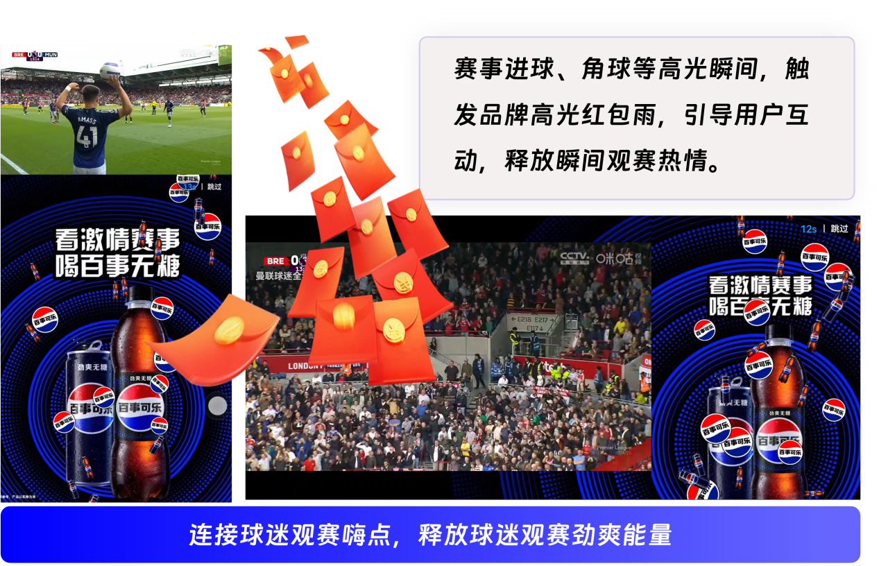英超赛事的高对抗性与不确定性,催生了进球、争议判罚、绝杀等一系列“情绪高点”,这些节点恰是品牌与用户建立情感连接的关键窗口。咪咕借助5G+AI技术实时捕捉赛场关键时刻,锁定用户情绪峰值触发“百事红包雨”互动广告,将品牌"劲爽挑战"的激情与赛事高潮完美结合,让品牌信息与观众的兴奋时刻同频共振,实现从情绪激发到互动参与的自然转化。
