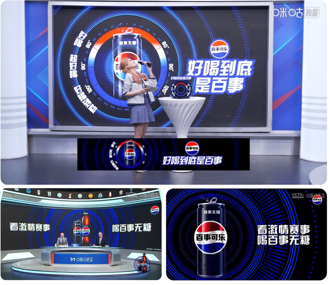 演播室作为赛事直播的核心场景,是品牌连接用户注意力的重要阵地。咪咕为百事定制了专属演播室空间,并根据品牌的季节营销主题进行更新:在4-6月英超争冠季聚焦“夜间体育场景”,演播室设计深度融入宵夜氛围视觉元素,强化“观赛+夜宵”的消费联想;而在9-10月“百事无糖劲爽挑战季”期间,定制“好喝到底是百事”主题视觉与互动话术,确保品牌当季核心信息得到最集中、最前沿的曝光。这种场景化植入使百事产品自然融入观赛氛围,与品牌同期活动形成强力联动,潜移默化地强化着百事可乐品牌记忆。