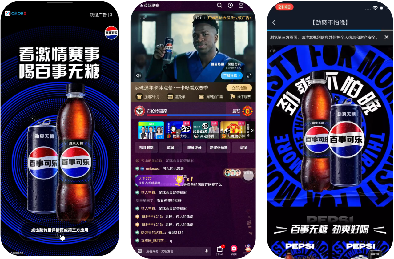 为了让英超赛事流量真正实现落地转化,双方打通“观赛-消费”链路,用户点击红包后,可一键跳转至百事品牌购买落地页,完成即时消费。这种“边看边买”的模式有效降低了消费决策阈值——球迷消费路径在赛事情绪驱动下,被压缩至“点击红包-跳转页面-下单支付”3步以内,充分展现了情绪经济对快消品销售的驱动力。