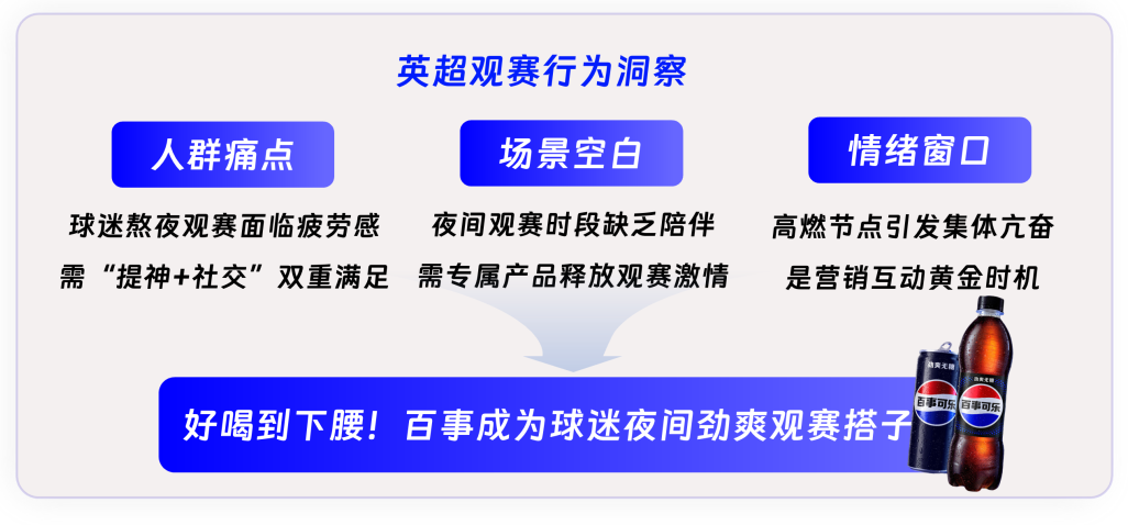 英超赛事多集中于北京时间晚上8点-次日凌晨,这一时段恰好与“夜经济”消费高峰重合。随着体育休闲成为夜间经济的重要组成部分,球迷观赛时往往伴随着"夜宵+饮品"的即时需求,为快消品牌创造了"观赛消费"的天然场景,也与百事营销主题形成了完美呼应。