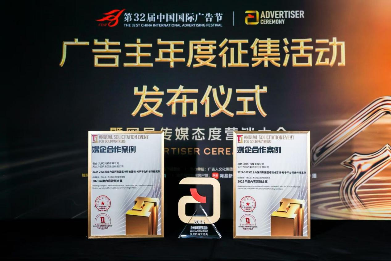 近日,第32届中国国际广告节 2025 金伙伴年度征集活动评审结果正式揭晓。天士力医药集团股份有限公司的“2024-2025 天士力医药集团医疗精准营销 - 知乎平台科普传播案例”,获得 “2025年度内容营销金案”。
