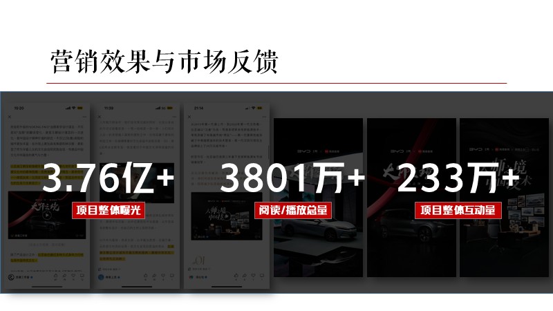 比亚迪全新系列视频营销项目《比亚迪大师之境:东方之下,匠心之上》交 出亮眼成绩单:项目整体曝光量突破 3.76 亿次,累计阅读 / 播放总量达 3801 万 +,用户互动量超 233 万次,凭借现象级的传播效应引爆全网,“共创未来” 的核心主题更是成为社交平台热议焦点,收获市场广泛好评。