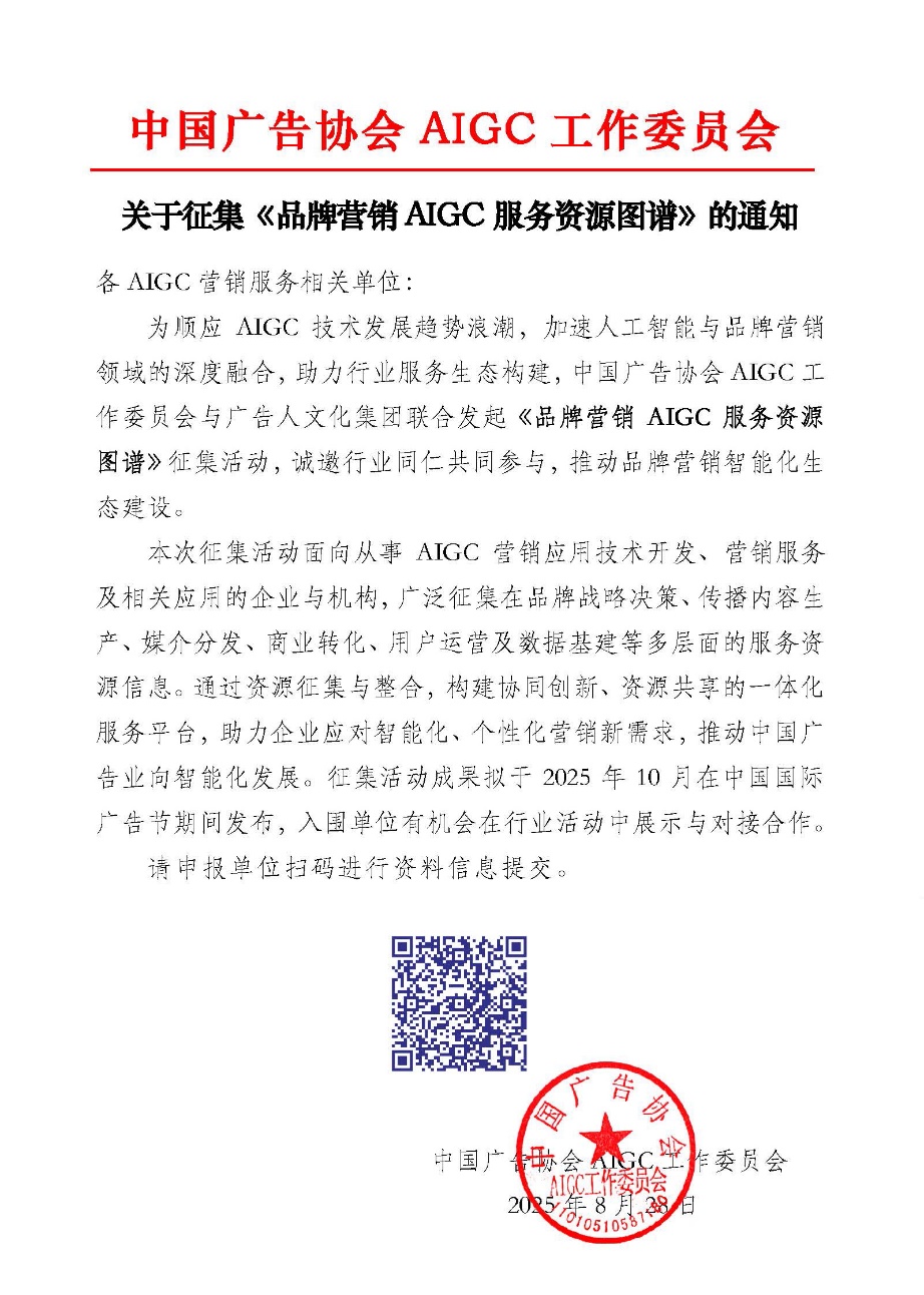 诚邀各品牌服务相关机构,踊跃加入《品牌营销AIGC服务资源图谱征集》!成为行业核心资源矩阵的关键一员,与同仁共赴AIGC营销新蓝海,共筑开放协同的行业新生态,以标杆实践引领方向,用创新成果赋能发展,携手推动品牌营销AIGC应用迈向更深度、更高效、更高质量的全新阶段!