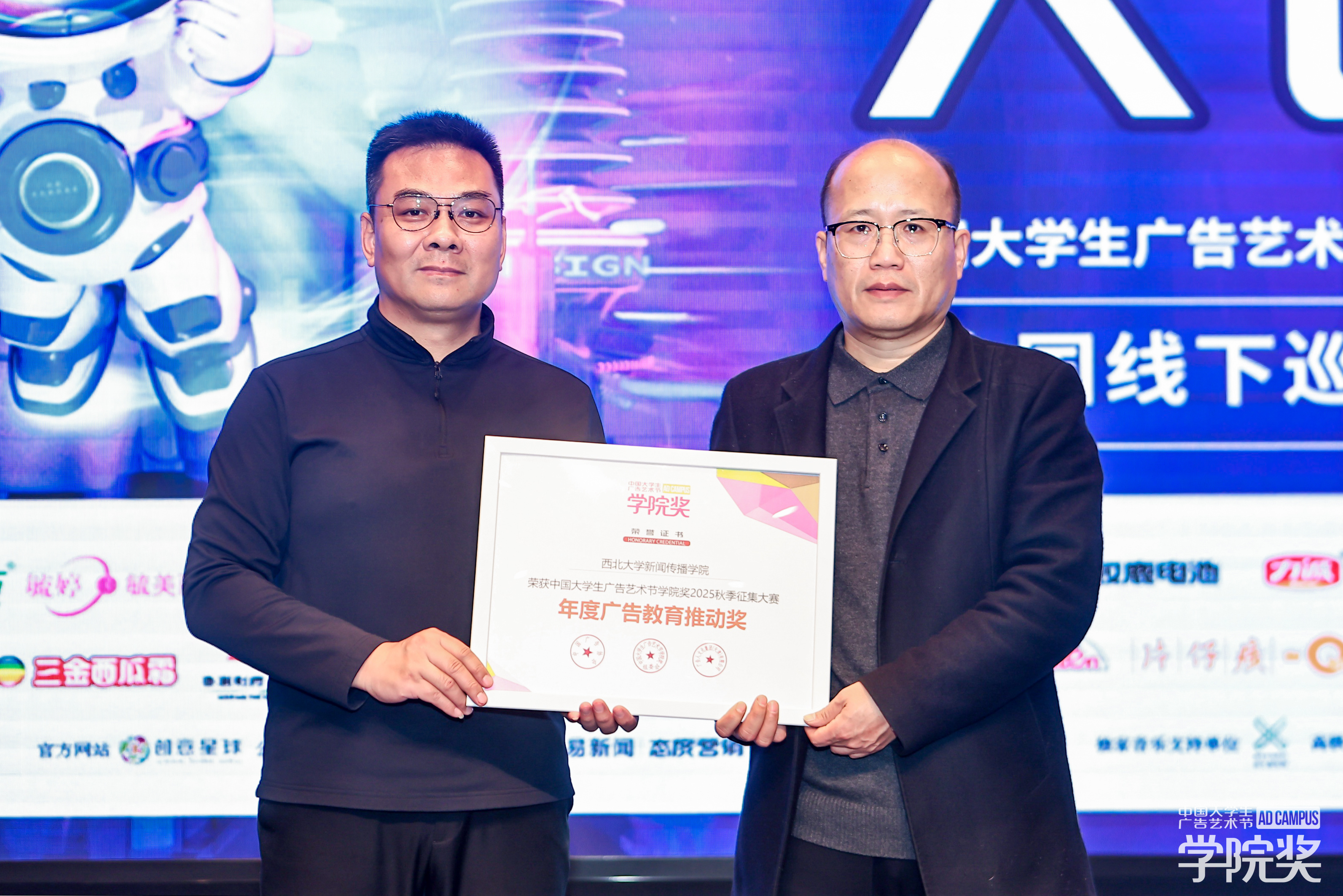 随后,广告人学院执行院长高鹏铭为西北大学新闻传播学院颁发“中国大学生广告艺术节学院奖2025秋季征集大赛·广告教育推动奖”证书,西北大学新闻传播学院教学副院长李安定代表学院上台领奖。这一奖项既是对学院深耕创意教育、促进教学与行业实践深度融合的认可,也进一步夯实了院校与学院奖携手赋能青年成长的合作基础。