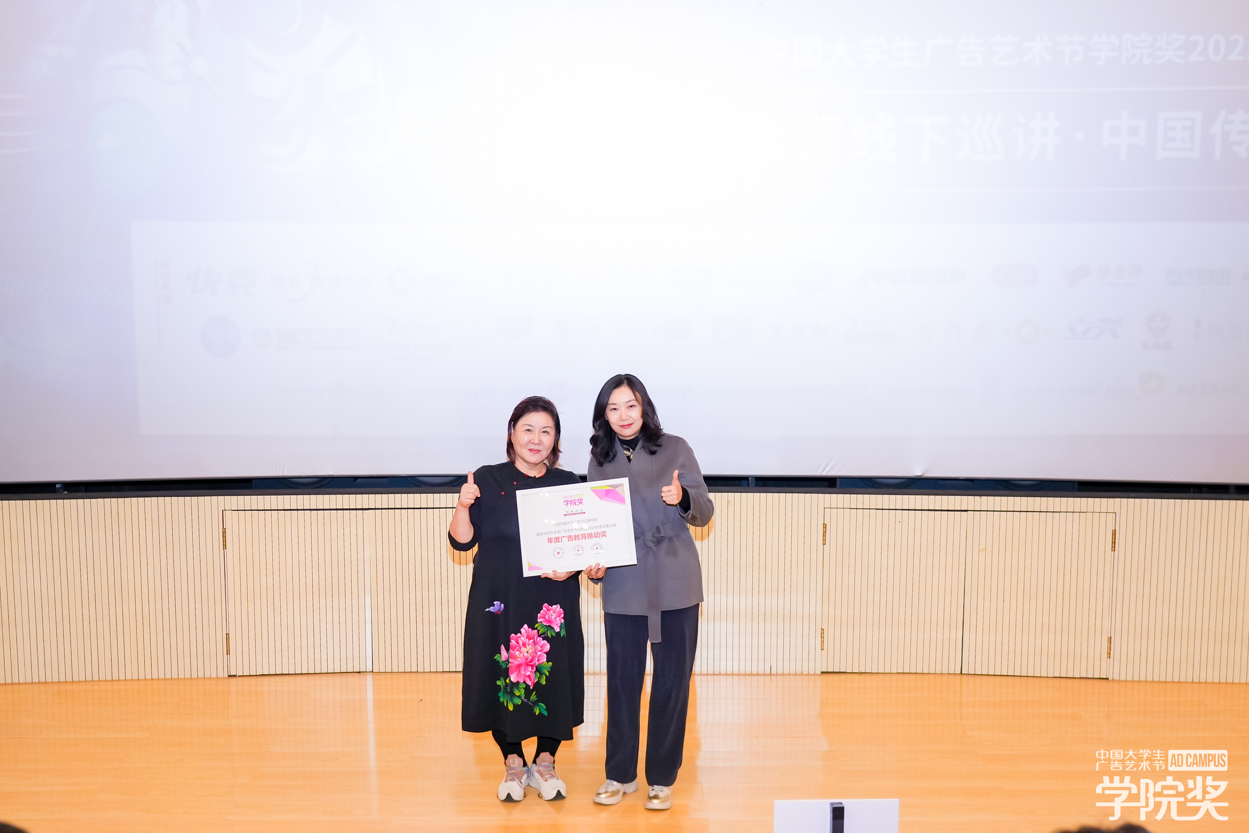 随后,中国广告协会副会长、广告人文化集团总裁穆虹女士代表组委会,向中国传媒大学广告与品牌学院颁发“中国大学生广告艺术节学院奖2025秋季征集大赛·广告教育推动奖”,由中国传媒大学广告与品牌学院侯玥副院长代表学院领奖。这一荣誉是对学院在广告与创意教育领域持续投入与卓越贡献的充分肯定。