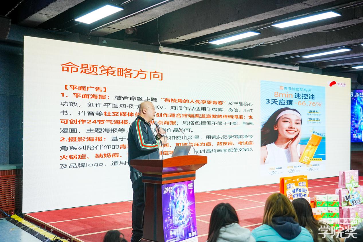 本次巡讲活动邀请到国内多家知名品牌的代表参与,来自默沙东、网易小蜜蜂、郁美净、华邦制药、雅客、立兴冻干的企业代表先后登台,结合各自的品牌特色和命题要求,为现场师生进行了深入浅出的解析。从品牌故事到产品特色,从命题策略到创意技巧,代表们的精彩分享成功地激发了同学们的创作灵感。
