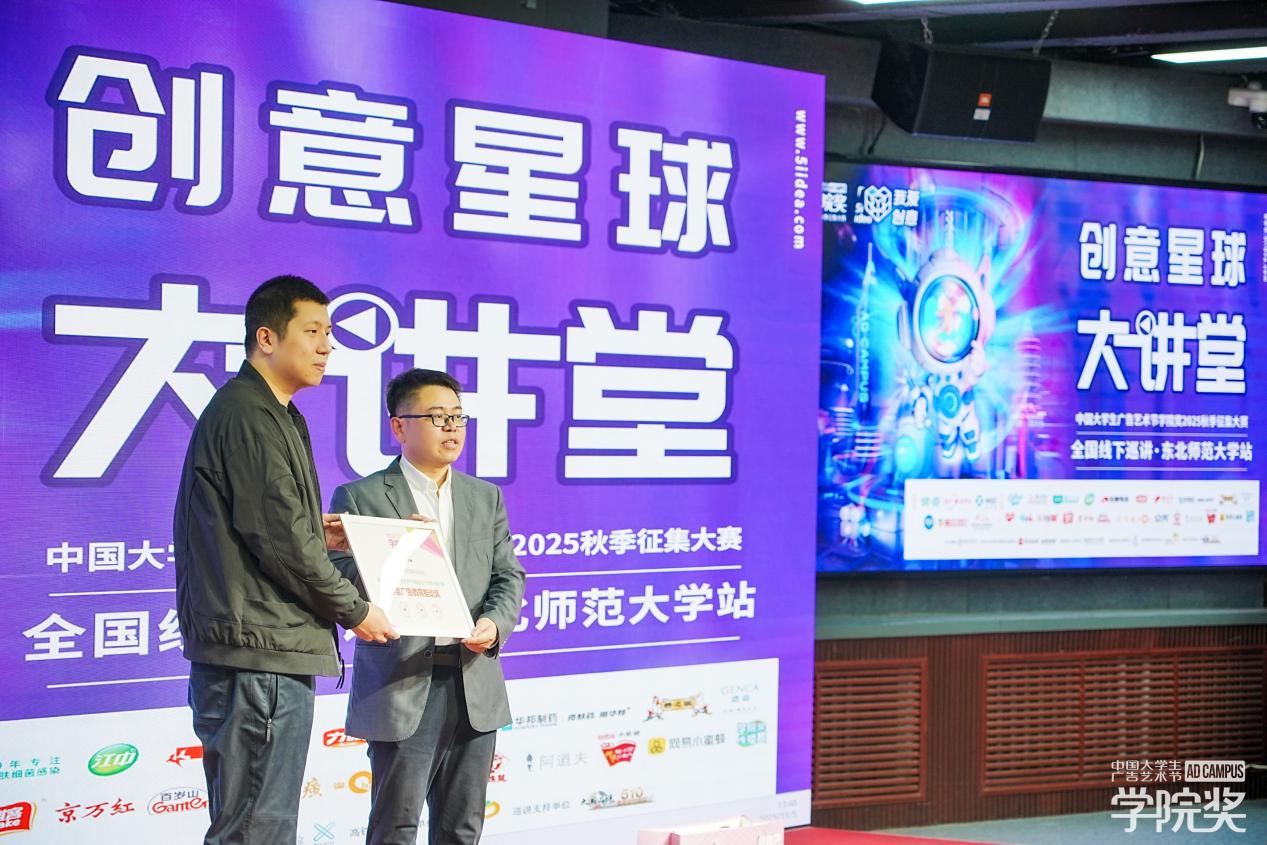 活动现场,东北师范大学传媒科学学院关丰富书记代表学院接受了由广告人文化集团市场总监王晓鹿先生颁发的“大学生广告艺术节学院奖2025秋季征集大赛·广告教育推动奖”荣誉证书,并合影留念。