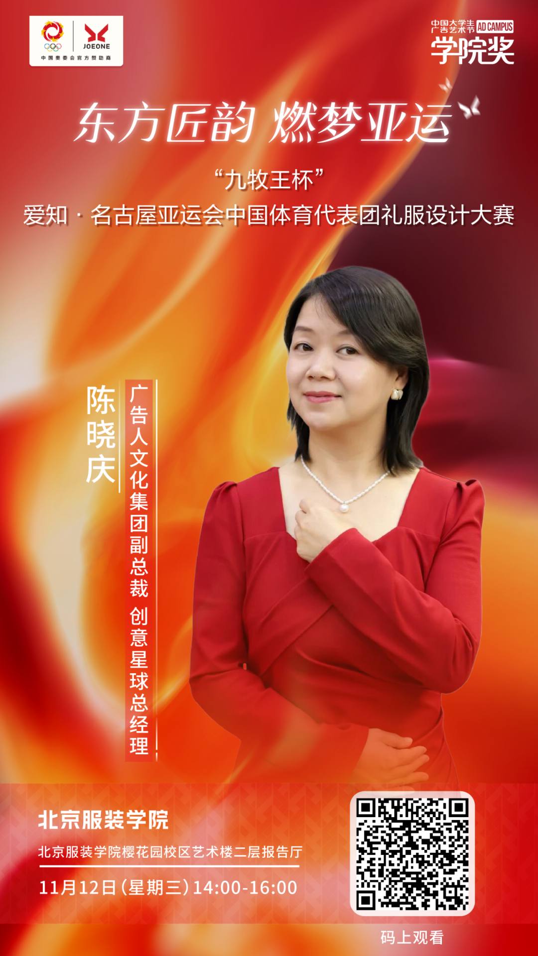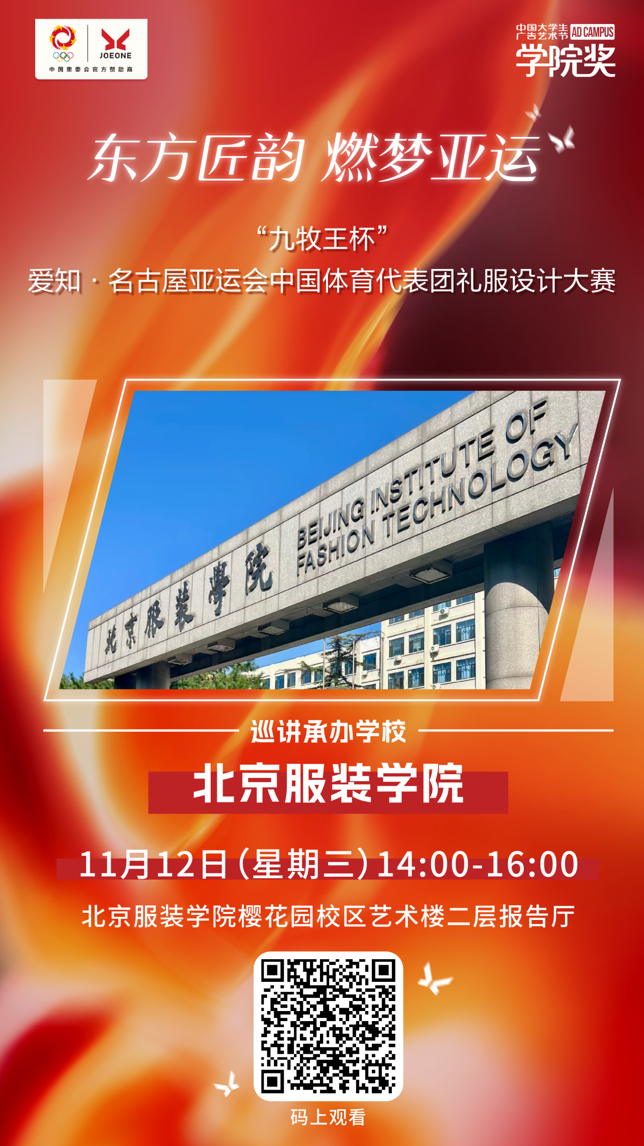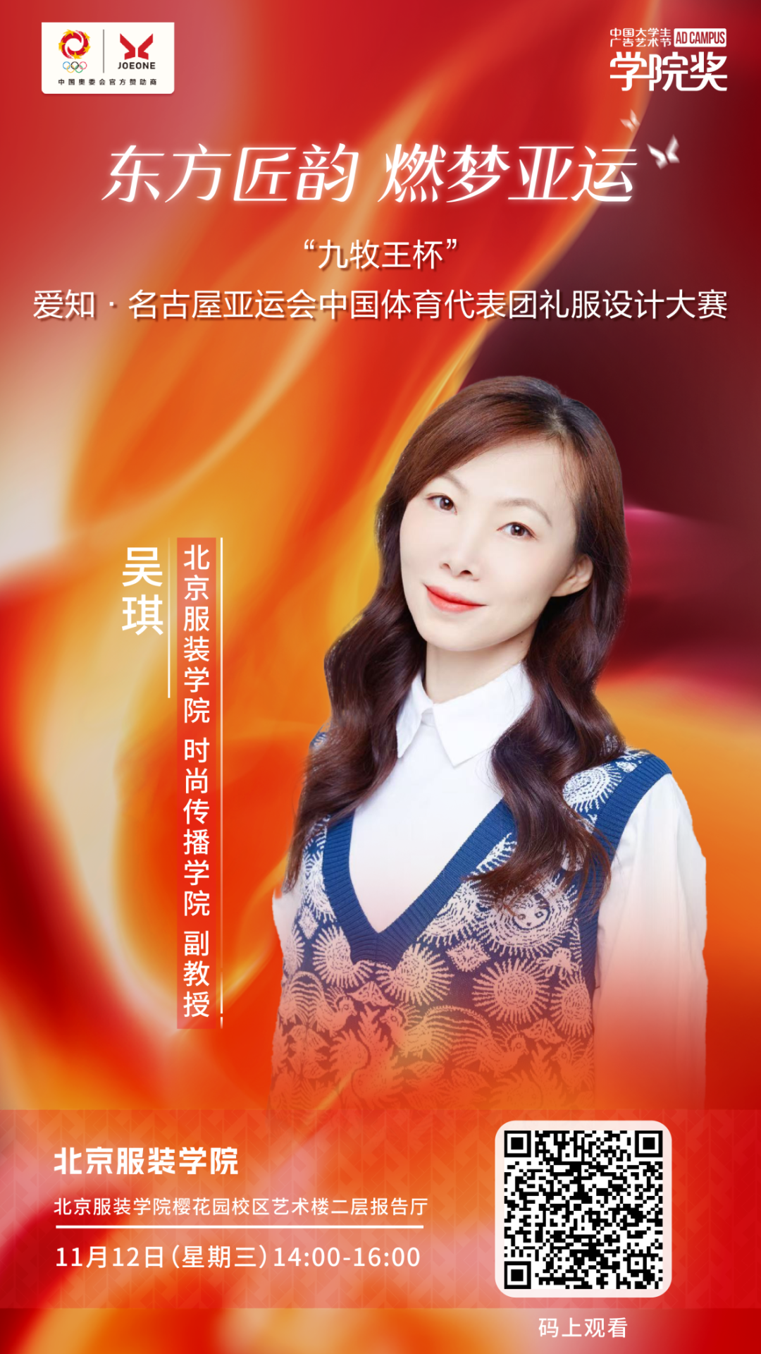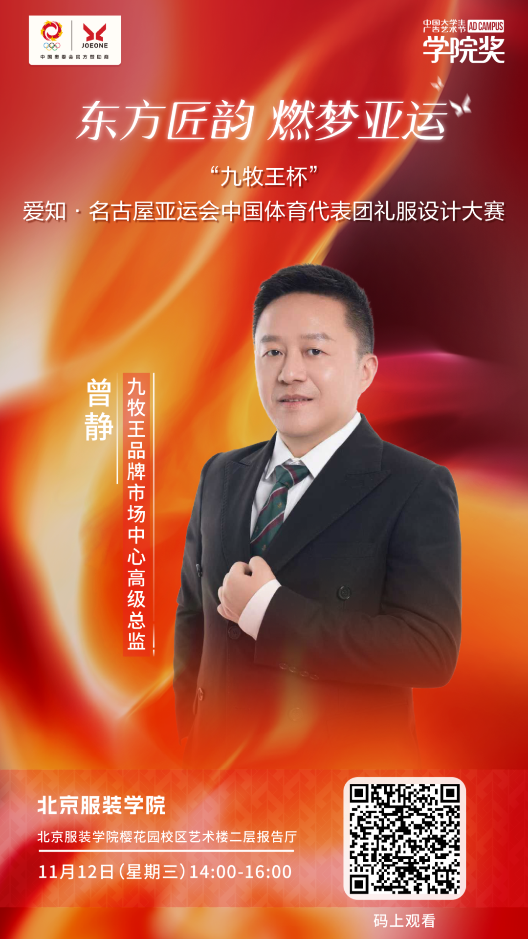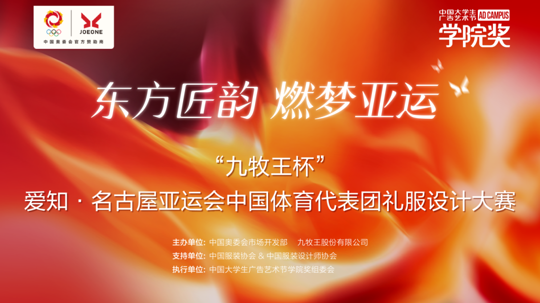 “九牧王杯” 爱知·名古屋亚运会中国体育代表团礼服设计大赛,由中国奥委会市场开发部与九牧王股份有限公司联合主办、中国服装协会 & 中国服装设计师协会支持、中国大学生广告艺术节学院奖组委会执行。