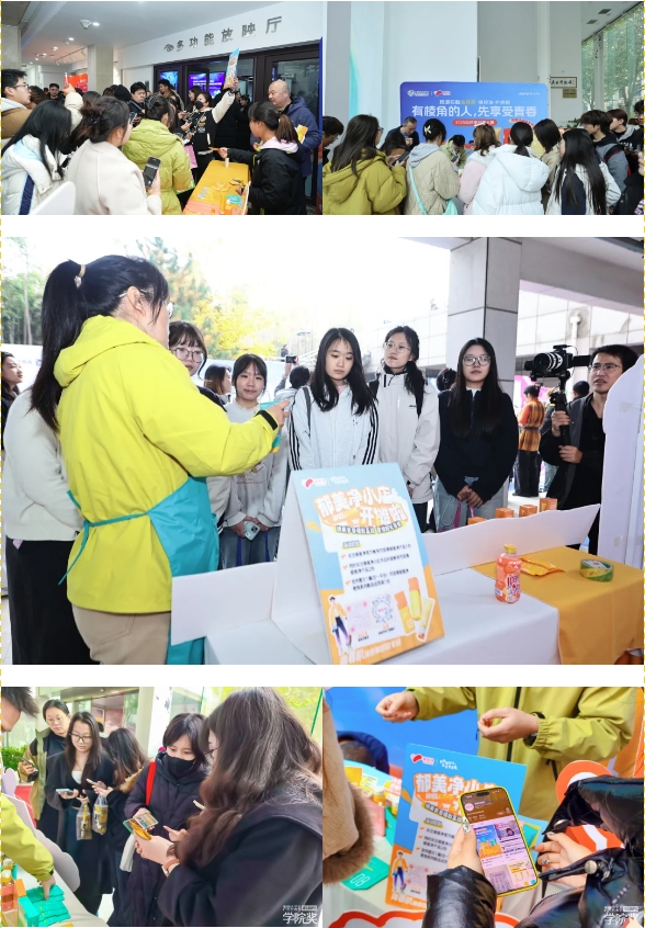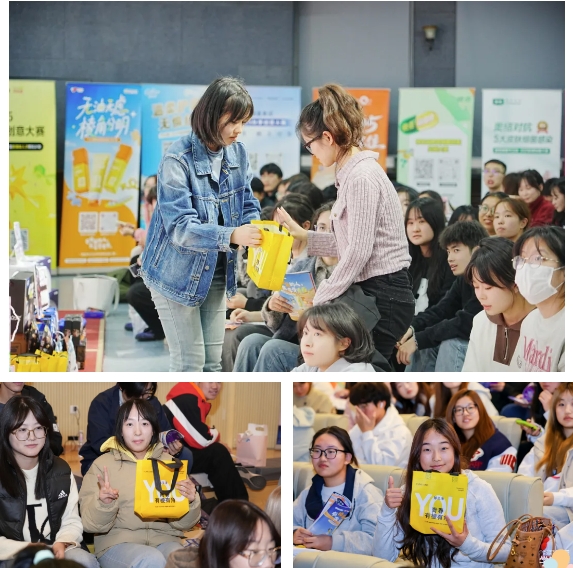宣讲还未开始,场外的互动区就以人气高涨。郁美净精心设置的创意体验区,结合品牌元素与青春主题,吸引众多学子驻足参与。定制礼品派发、主题打卡装置……学子们在轻松的氛围中感受品牌魅力,纷纷拍照记录,主动分享。