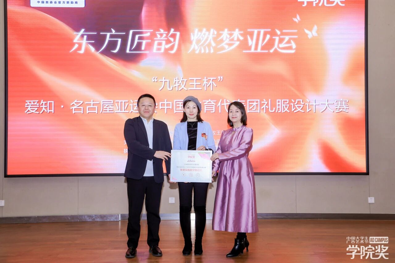 九牧王品牌市场中心高级总监曾静先生与大学生广告艺术节学院奖副秘书长、创意星球总经理陈晓庆女士共同登台,为北京服装学院时尚传播学院授予“大学生广告艺术节学院奖2025 秋季征集大赛·实践教学推动奖”,北京服装学院时尚传播学院吴琪副教授,代表院校接受这份殊荣。这一刻不仅是对北服教学实力的认可,更是校企携手、以实践赋能设计教育、以创意传承东方匠韵的美好开端。