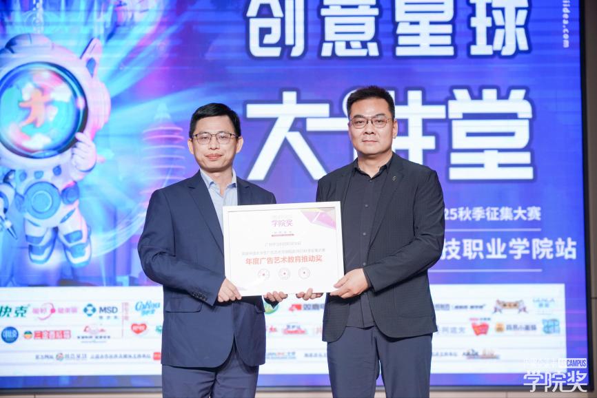 广告人学院执行院长、大广节学院奖产教融合委员会主任高鹏铭为广州华立科技职业学院颁发“中国大学生广告艺术节学院奖2025秋季征集大赛·广告教育推动奖”证书,广州华立科技职业学院校长助理李鹏代表学院上台领奖。这一奖项既是对学院长期深耕创意教育、推动广告教学与行业实践深度融合的认可,更为院校与学院奖携手赋能青年创意成长进一步夯实了合作基础。
