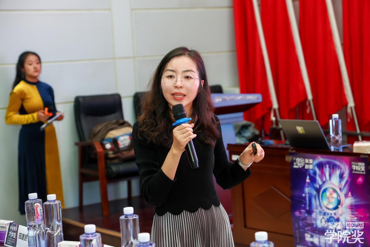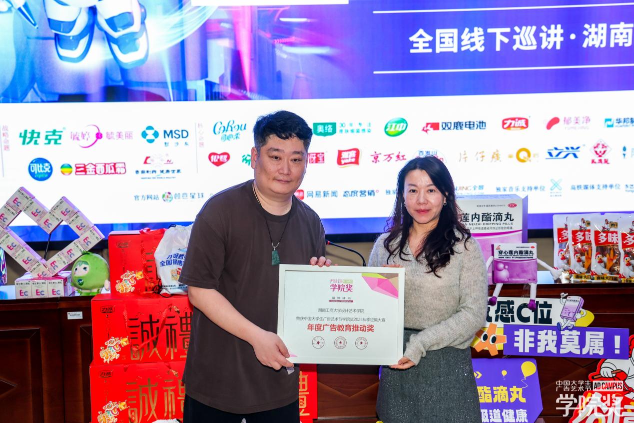 活动现场,刘丽老师代表湖南工商大学设计艺术学院接受了学院奖组委会所颁发的“年度广告教育推动奖”,广告人文化集团市场总监袁林先生代表组委会为校方颁发这一荣誉。