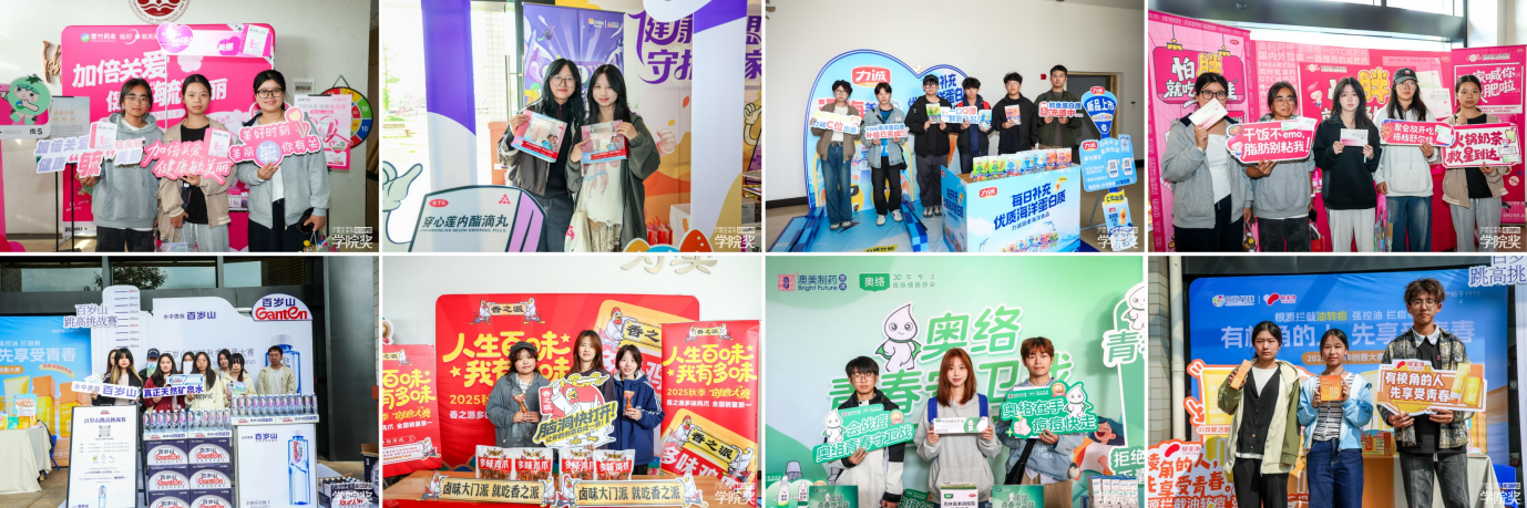 场内课堂创意激荡,场外品牌展区氛围感拉满!毓美丽、鲁南制药-舒尔佳、天士力、香港澳美-奥络 、力诚食品、香之派、郁美净、百岁山八大品牌打造专属互动空间,邀请学子们沉浸式感知品牌、体验产品、参与趣味互动。告别单向信息传递,学子们在亲身参与中深度理解品牌,不仅拉近了与品牌的距离,更积累了丰富多元的创意素材,为后续创作筑牢基础。