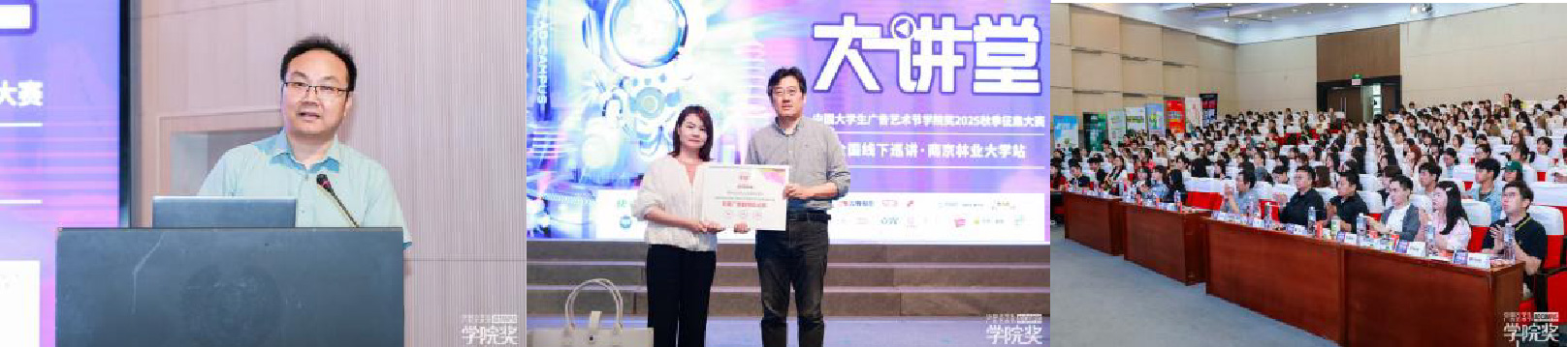 2025年9月26日下午,学院奖2025秋季征集大赛实践课程进校园——“创意星球大讲堂”在南京林业大学教五楼报告厅成功举办。本次活动作为学院奖全国巡讲的重要一站,延续了“创意不止,席卷中华”的主题精神,通过企业命题解析、创意大师分享、教育推动力颁奖等丰富环节,为南京林业大学的学子们搭建起一个与行业前沿深度对话的平台,进一步推动了广告教育与产业实践的深度融合与创新发展。