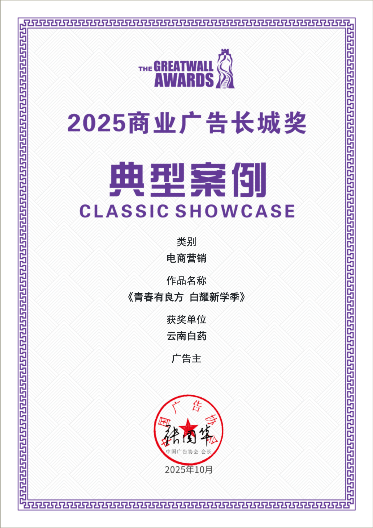 在广告主年度案例评选中,云南白药《青春有良方 白耀新学季》电商营销案例,凭借其对Z世代消费群体的精准洞察、清晰的策略逻辑与显著的市場实效,成功荣膺 “广告主年度征集活动·年度电商营销金案” 称号,并荣获“2025商业广告长城奖·电商营销类经典案例”权威认可。