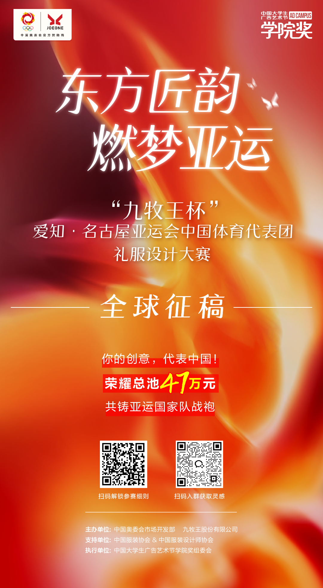为让东方匠韵通过国礼设计闪耀国际舞台,九牧王联合中国奥委会市场开发部,携手中国服装协会、中国服装设计师协会,以及中国大学生广告艺术节学院奖组委会,共同发起“九牧王杯”爱知・名古屋亚运会中国体育代表团礼服设计大赛。