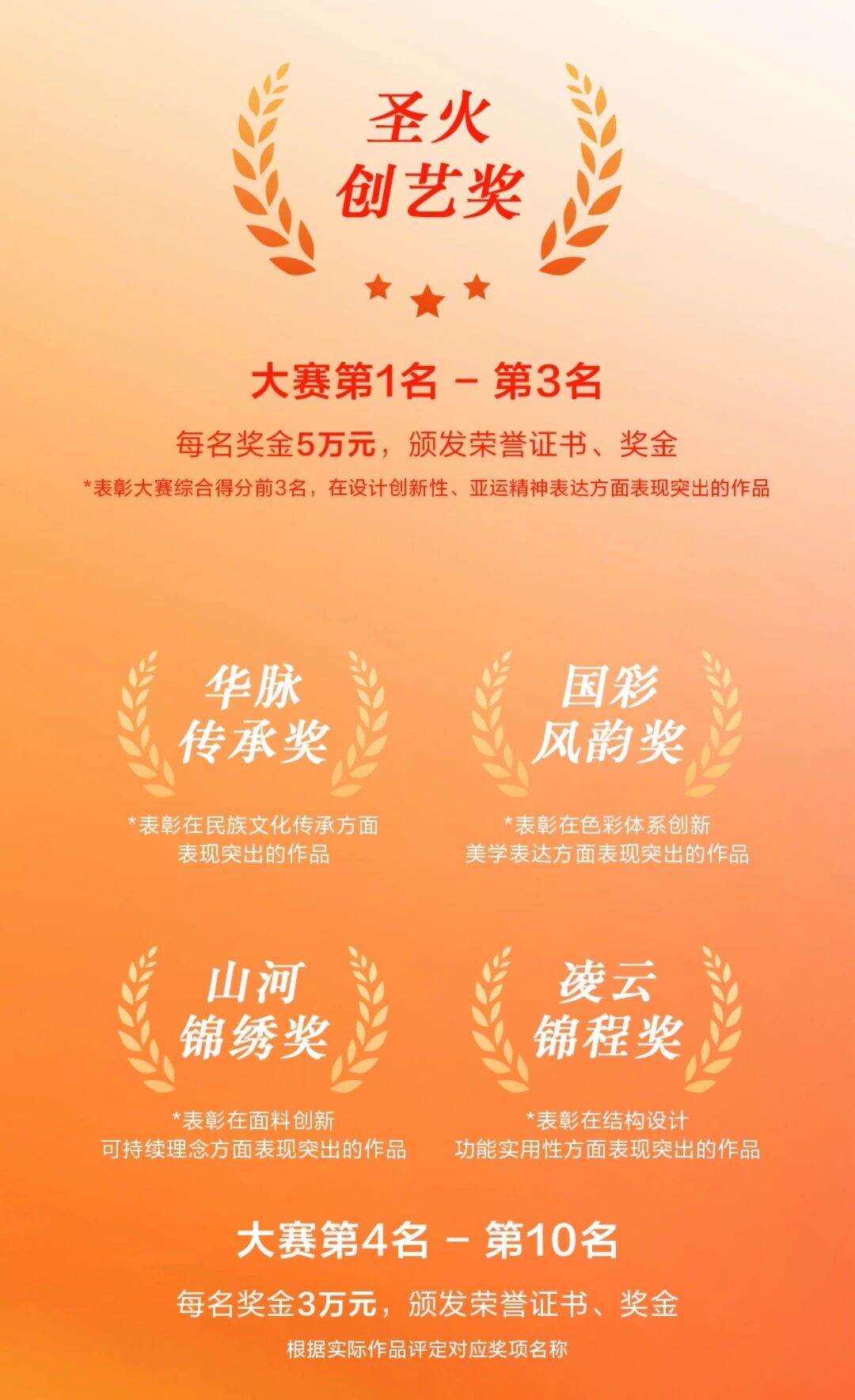 大赛重磅加码47万元豪华奖金矩阵,大赛前10名奖项以“圣火创艺”“华脉传承”“国彩风韵” “山河锦绣”“凌云锦程”命名。将亚运精神传递、文化传承使命、国色美学创新等内核融入奖项名称中,让每一份荣誉都成为“东方匠韵”的鲜活表达!