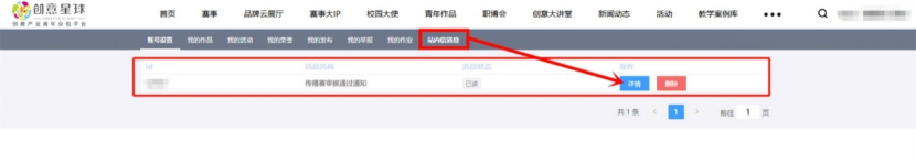 *学院奖官网登录账号后在如上位置查收站内信消息,查看作品审核通过情况