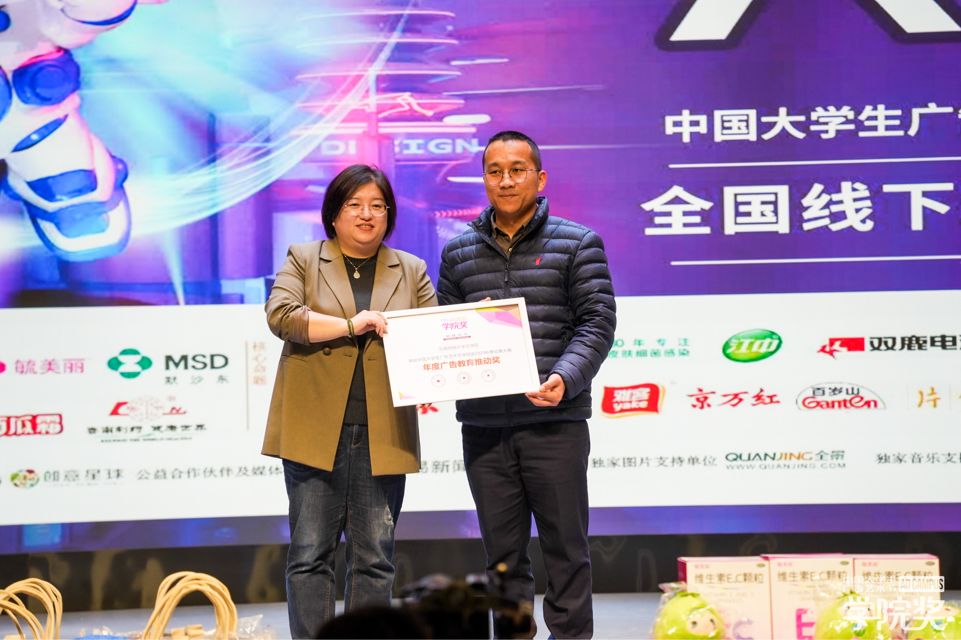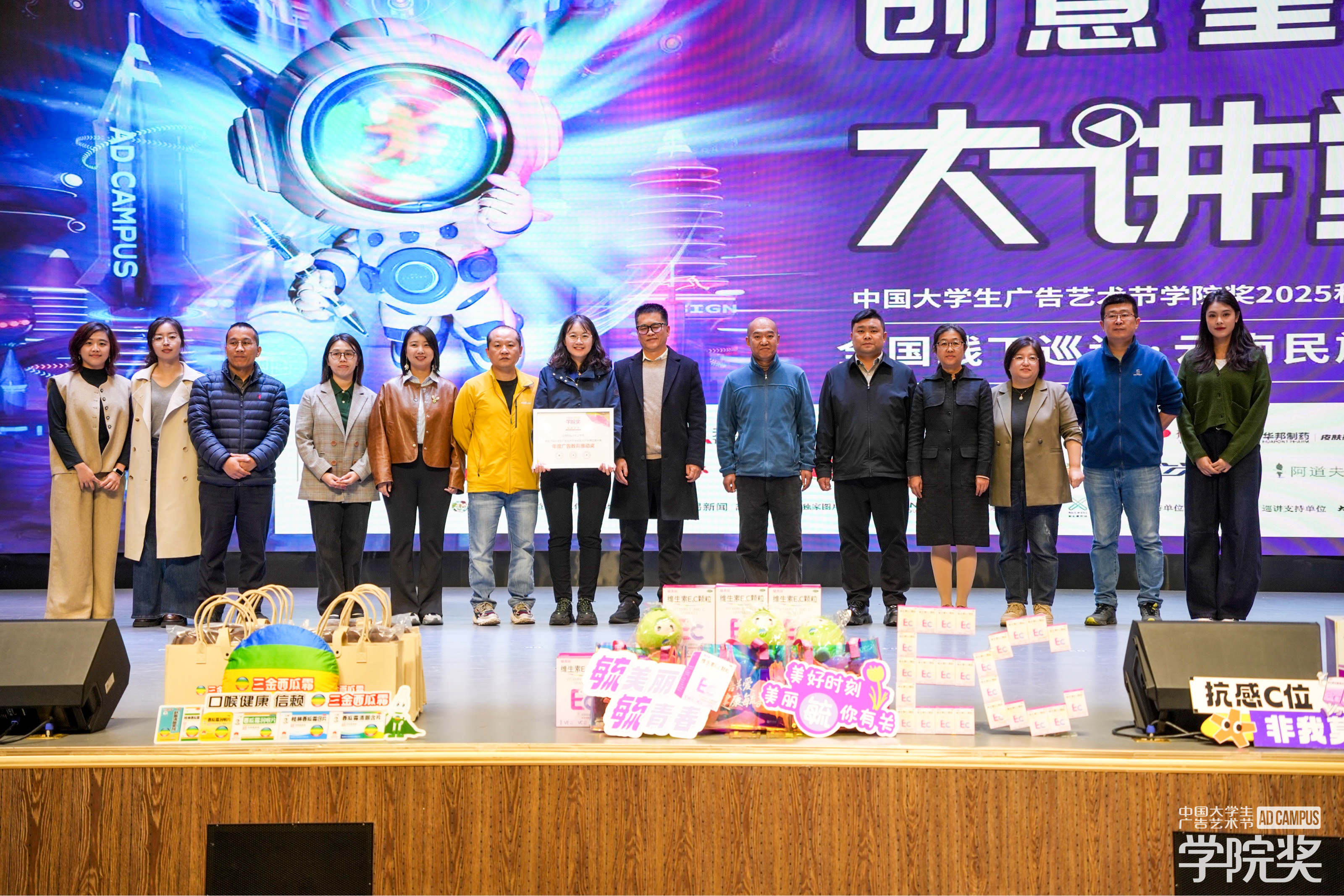 随后,广告人文化集团市场总监李敏女士为云南民族大学文学院颁发“中国大学生广告艺术节学院奖2025秋季征集大赛·广告教育推动奖”荣誉证书,文学院副院长茶志高代表学院领奖,此次获奖充分肯定了云南民族大学文学院在广告教育与创意人才培养方面的突出贡献。