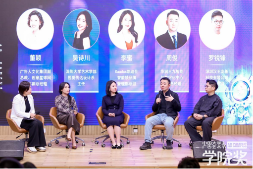 围绕“AI时代的有效营销”与“品牌年轻化对话”两大议题,圆桌环节在董颖的主持下展开深入讨论。深圳大学艺术学部视觉传达设计系主任吴诗川与Kaadas凯迪仕智能锁品牌管理部总监李蜜、华润三九智能与数字化中心助理总经理周俊、深圳汉王友基科技有限公司品牌总监罗锐锋,从教育、家居、健康、数字创作生态等多维度分享了各自的经验与思考。