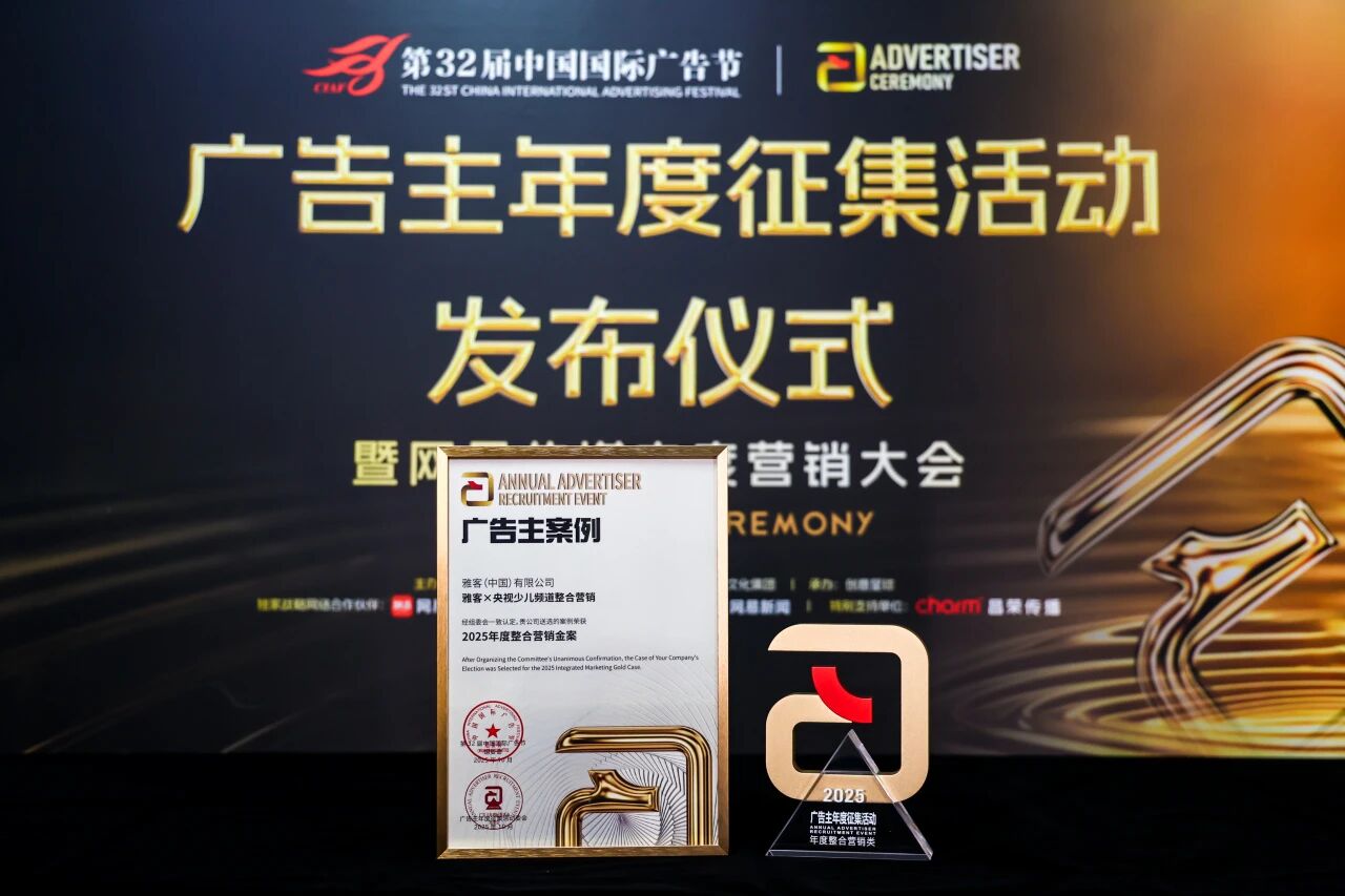 在广告节的核心重磅环节——第32届中国国际广告节·广告主年度征集活动发布仪式上,年度案例荣誉榜单正式揭晓。由雅客(中国)有限公司选送的《雅客×央视少儿频道整合营销》案例,凭借清晰的策略逻辑、创新的整合思维与显著的市场实效,从众多优秀案例中脱颖而出,荣膺“年度整合营销金案”称号。